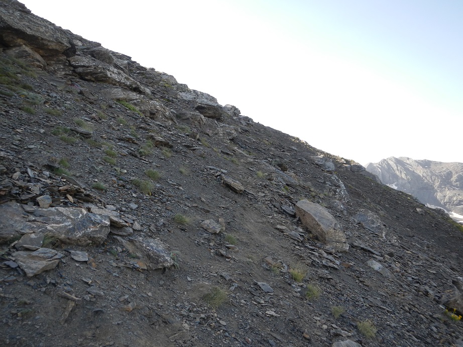 Ahora seguimos por terreno más descompuesto. Alcanzamos unos corredores que según la época del año pueden tener nieve.