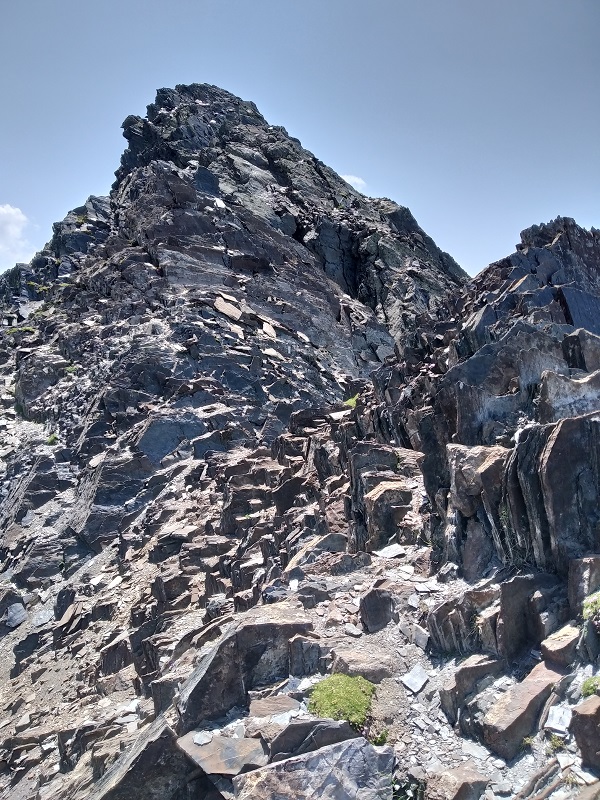 Desde la cumbre descendemos fácilmente hasta otro pequeño destrepe y enseguida estamos en la base del que puede ser el paso más técnico de la cresta, IIIº+.