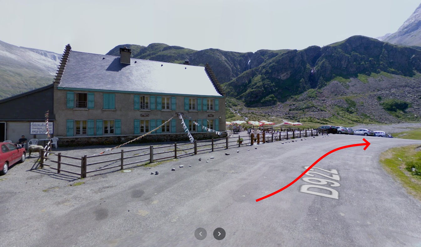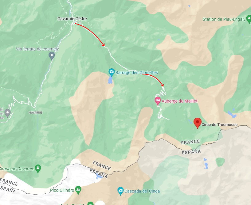 Seguimos la carretera asfaltada y llegamos al Auberge de la Munia. Continuamos hasta el Auberge du Maillet. En este punto en verano, en torno a las 08:00 horas cortan la carretera y un tren tirado de un tractor asciende a turistas y montañeros hasta el último parking del circo de Troumouse.