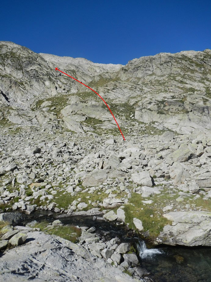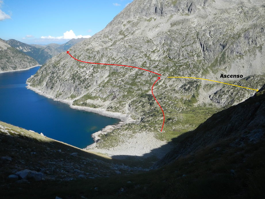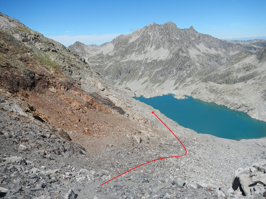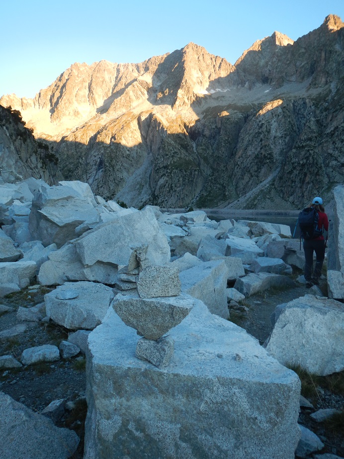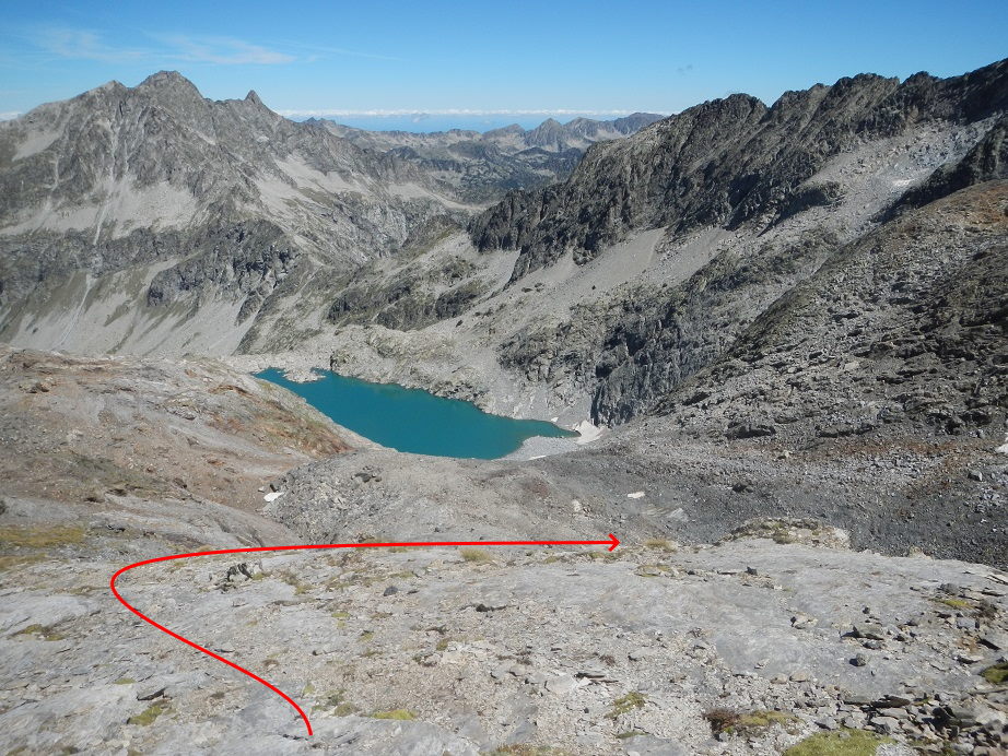 Unos hitos junto al lago nos llevarían también al pico Pale de Crabounouse, pero buscamos otros hitos más a la derecha que nos llevan hacia la cresta que forman las dos cumbres.