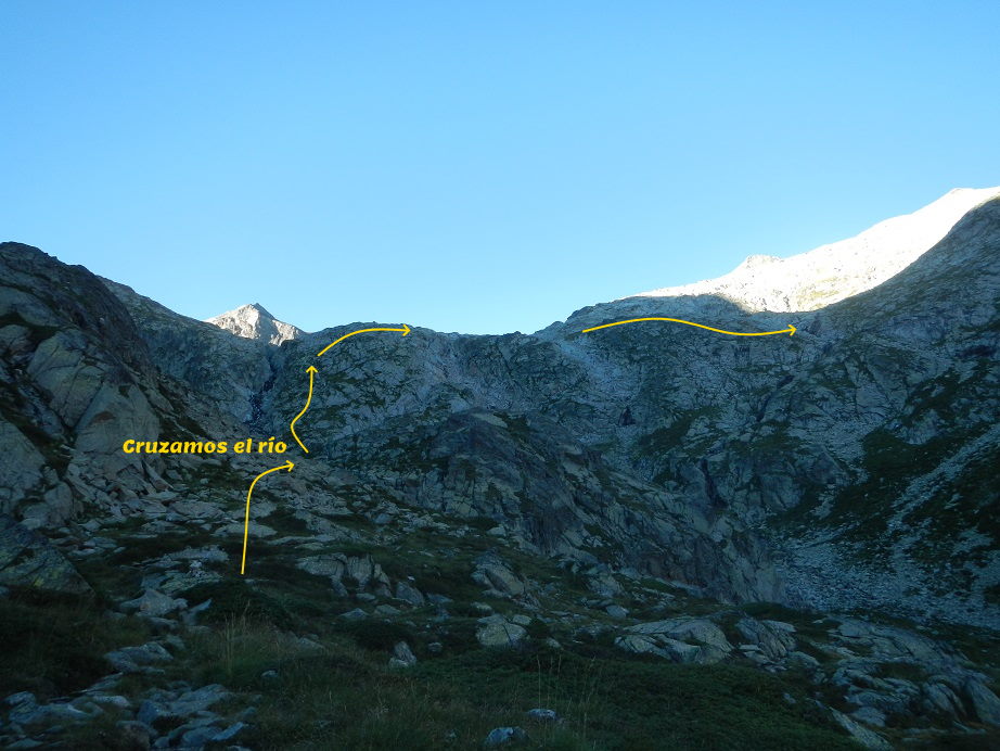 Lo cruzamos y avanzamos fuera de sendero con tendencia a la izquierda y buscando el terreno más amable.