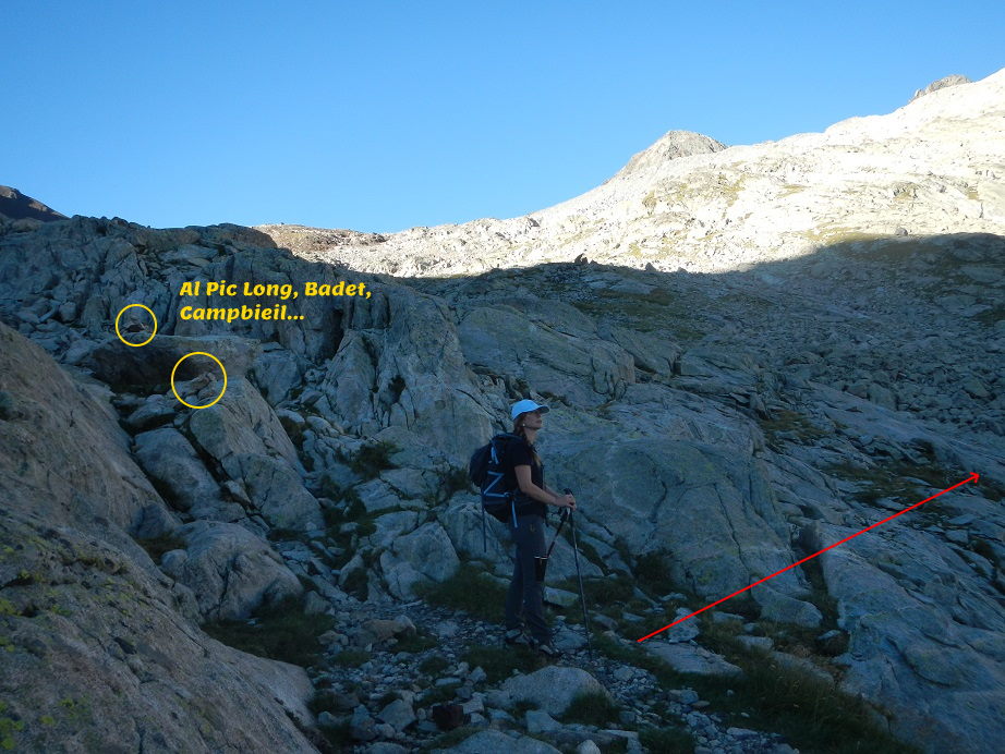 - 1- Seguir la ruta normal que nos lleva hacia la Hourquette de Cap Long , el Pic Long y sus cumbres vecinas y luego desviarnos a la derecha haciendo una cómoda travesía por terrazas herbosas.