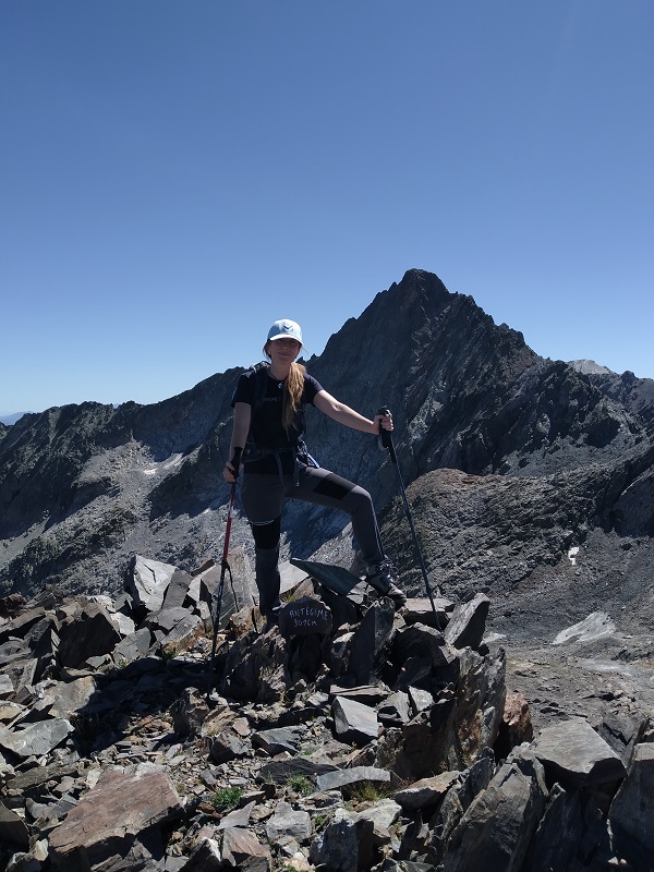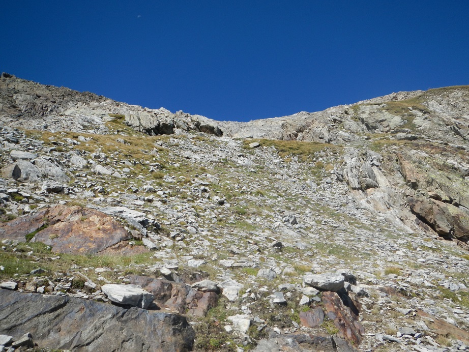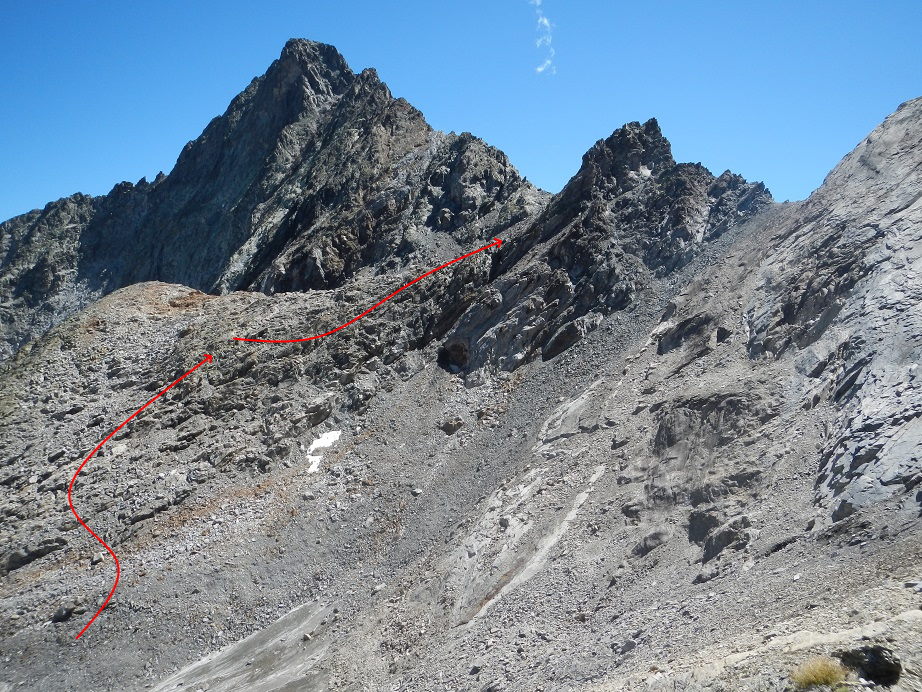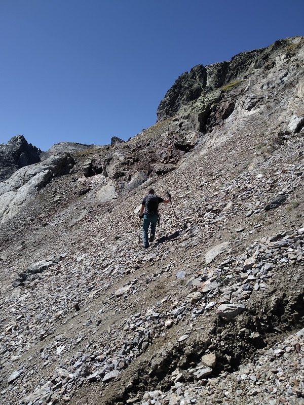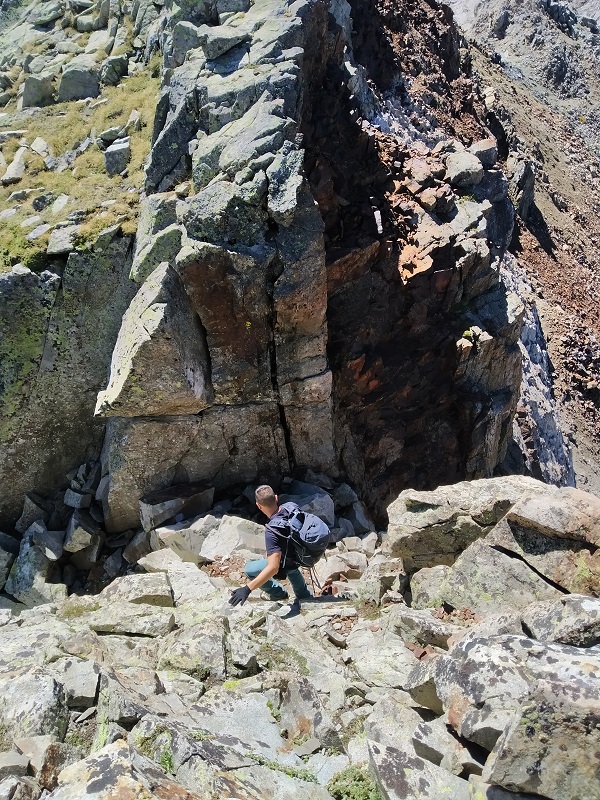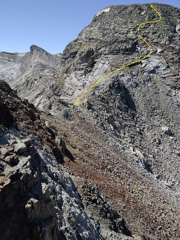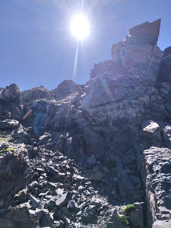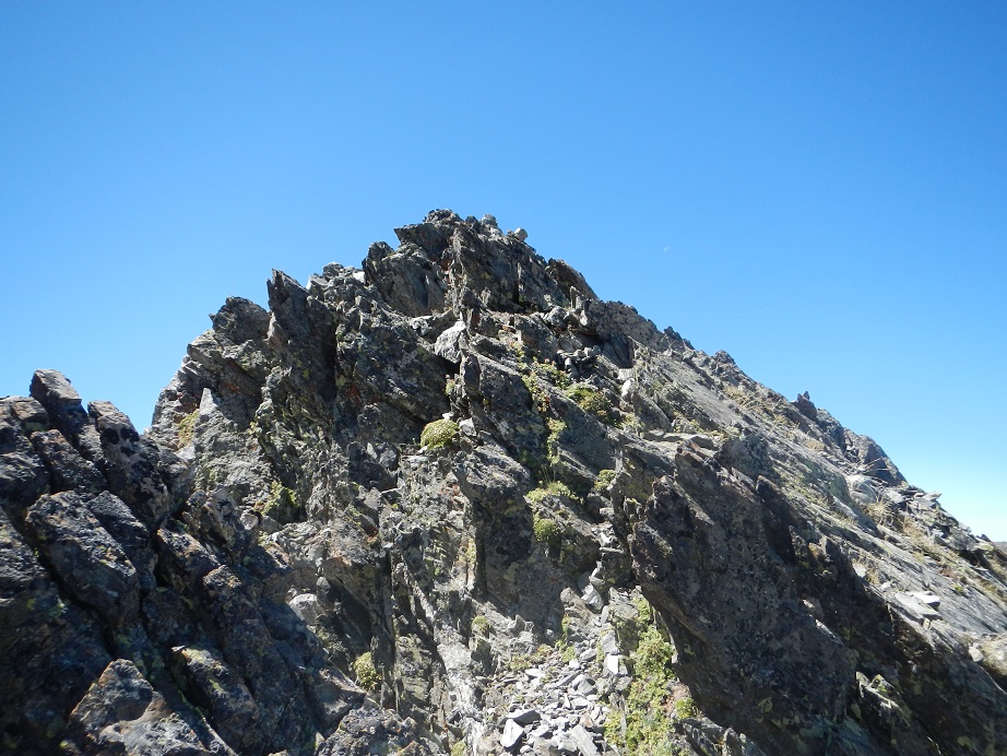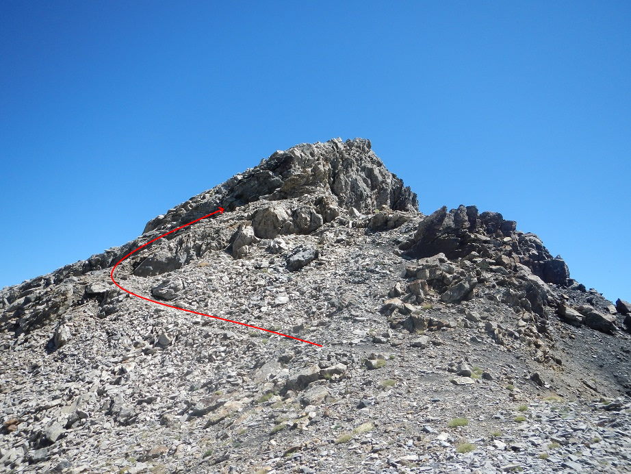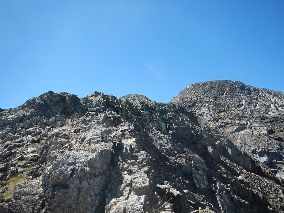Sin llegar al collado entre el Dent d’Estibére y el Pico Long, buscamos la parte más fácil donde solo debemos apoyar las manos para coronar la cumbre. Es la parte izquierda de la cumbre.