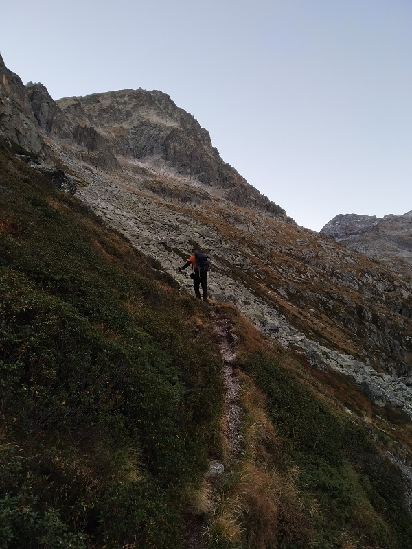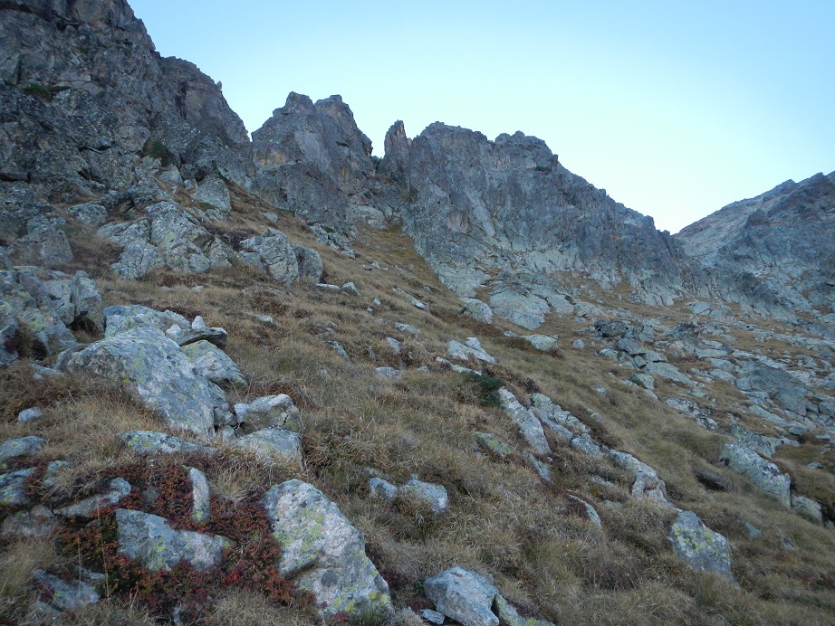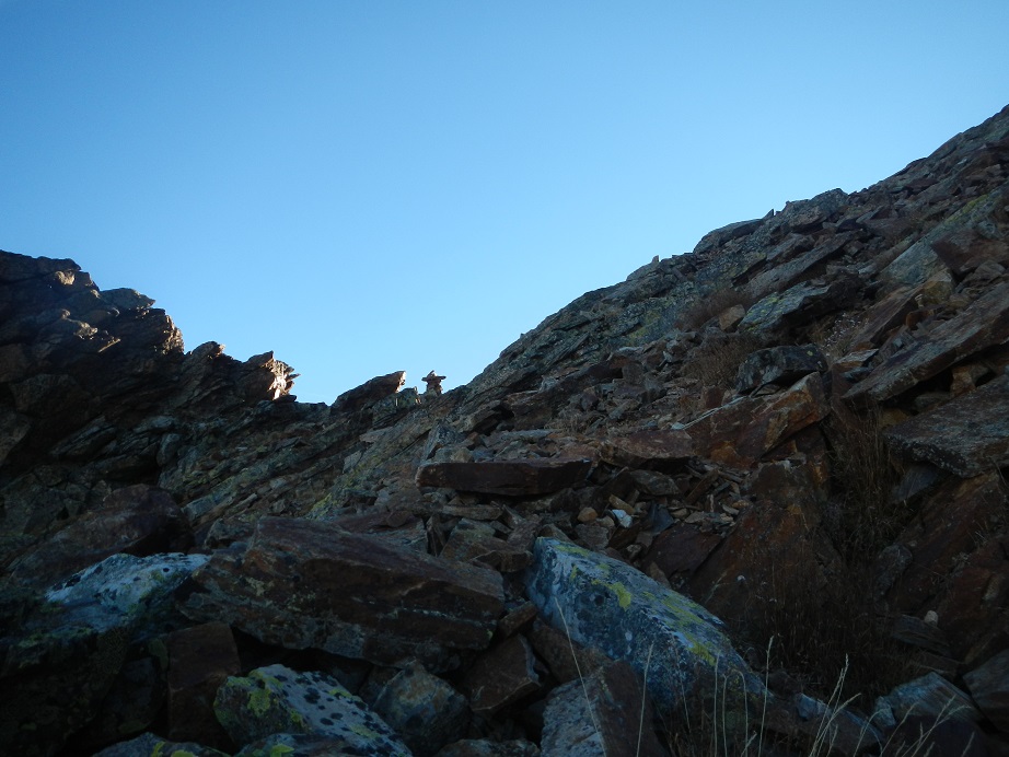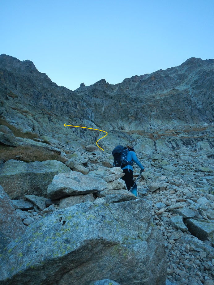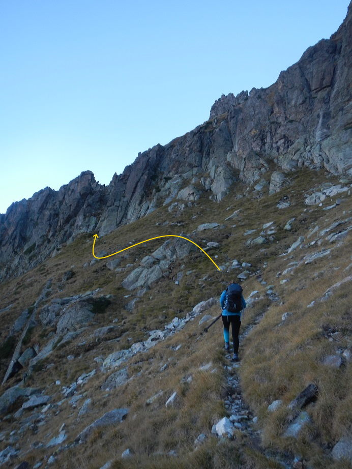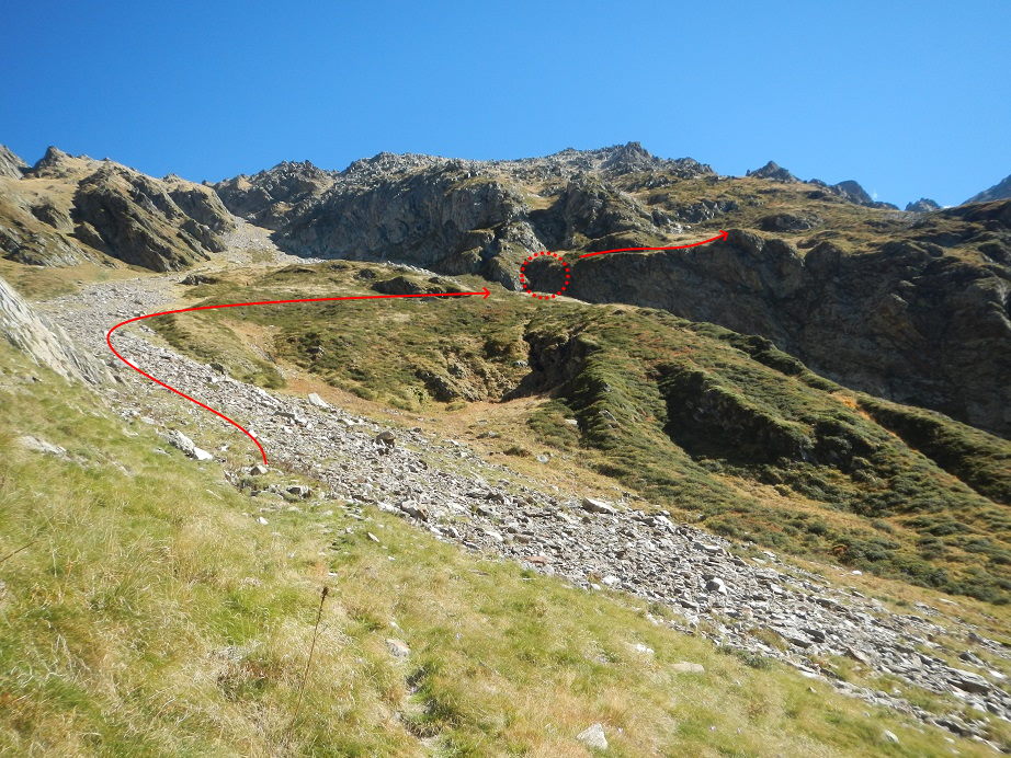 El sendero que parte desde el refugio al principio es algo difuso. Debemos ir a media ladera hasta llegar a una marcada pedrera y luego girar a la derecha. El camino sigue un tramo herboso hasta terminar bajo una pared con un hito en su base.