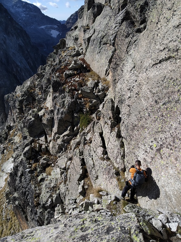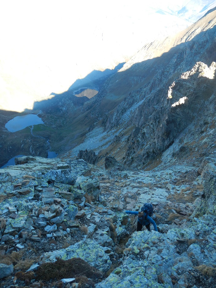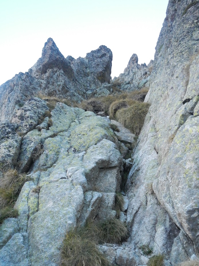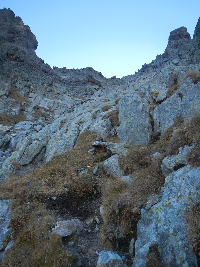Encontramos una canal de roca descompuesta, la cruzamos a la izquierda.