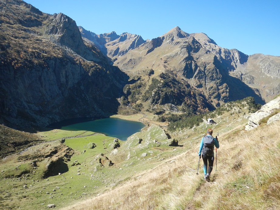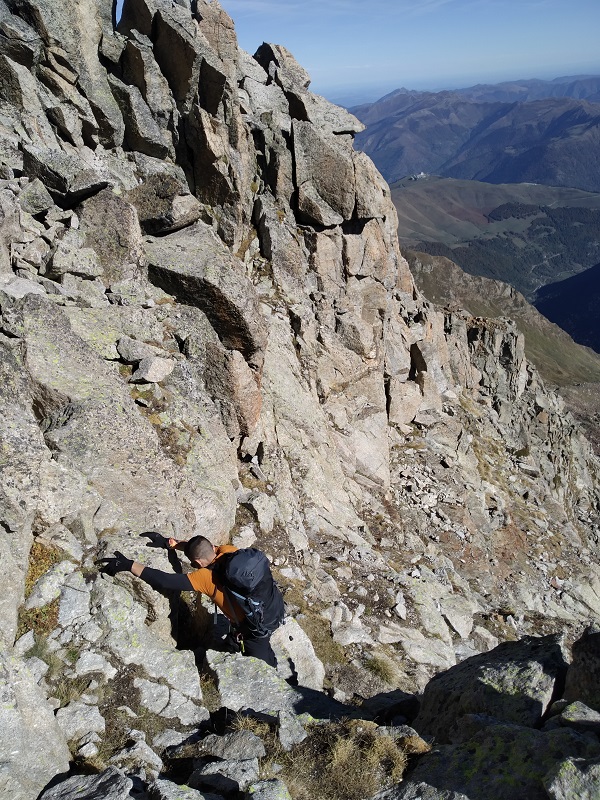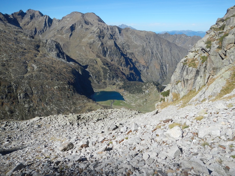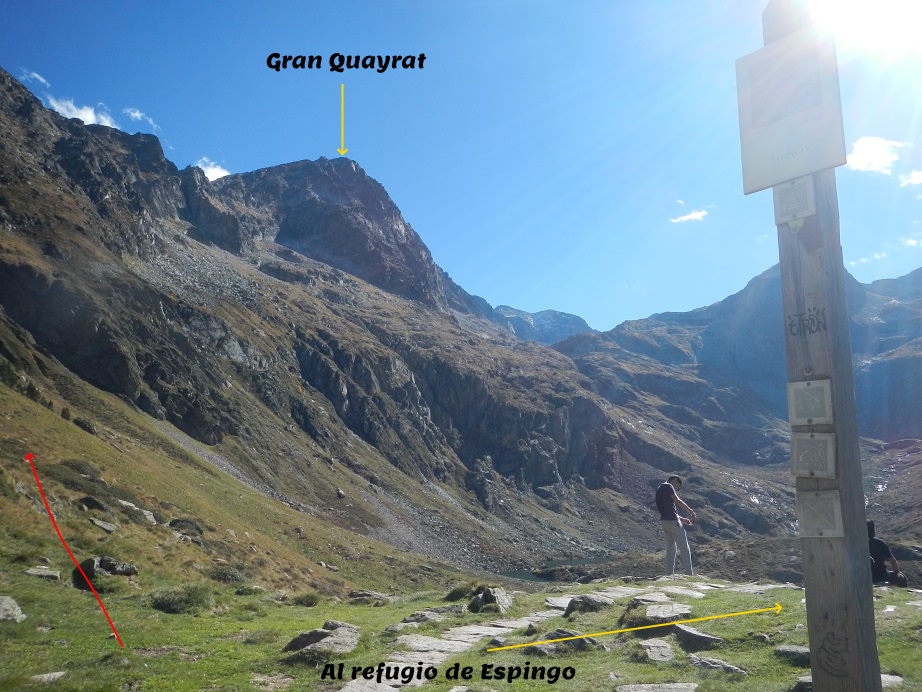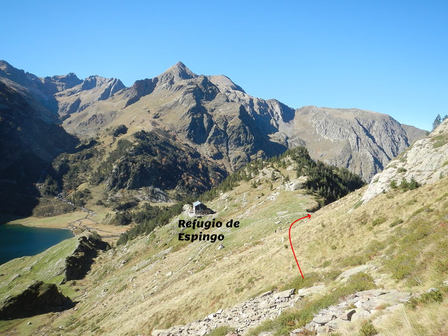 Y destrepamos el tramo de pared con el hito en la base. Seguimos ya con vistas al Lac y refugio de Espingo.