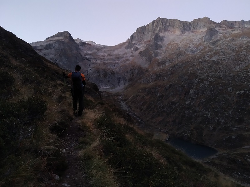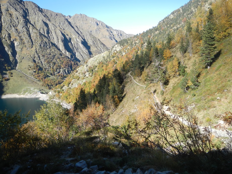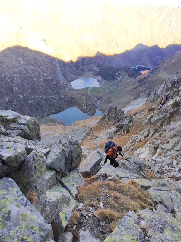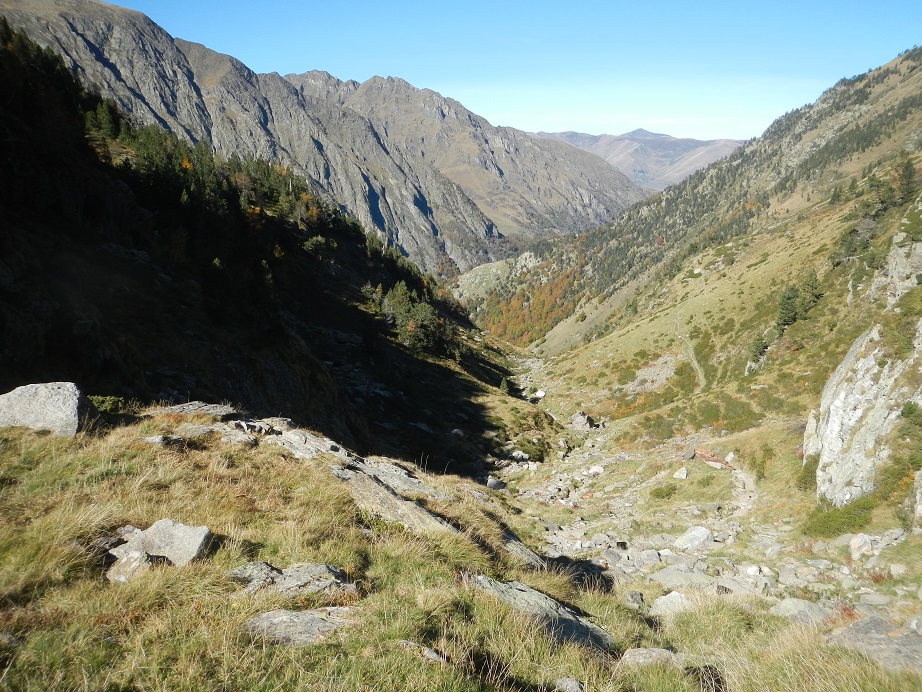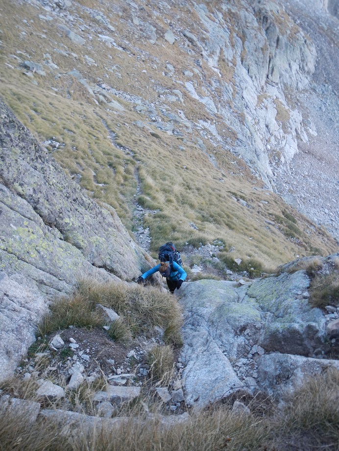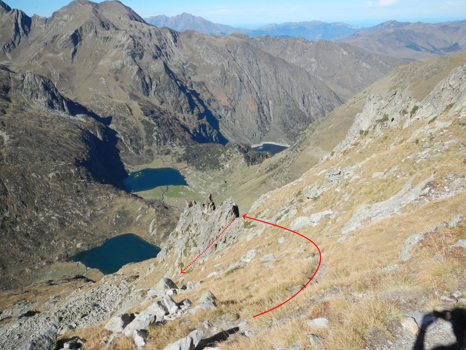 Y destrepamos el tramo de pared con el hito en la base. Seguimos ya con vistas al Lac y refugio de Espingo.