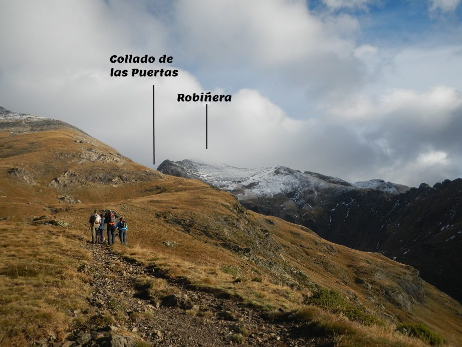Seguimos el sendero, bajo el pico Chinipro (izquierda), en dirección al collado de las Puertas, tras el que se encuentran los ibones de la Munia. No debemos llegar hasta este collado, hay que tomar un desvío a la derecha.