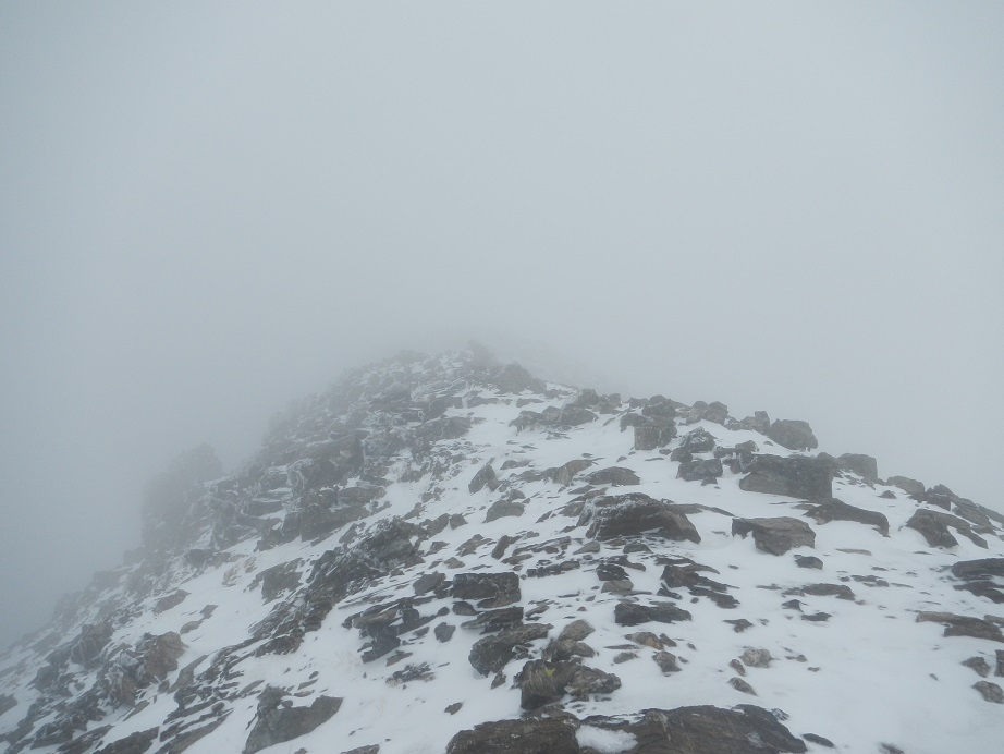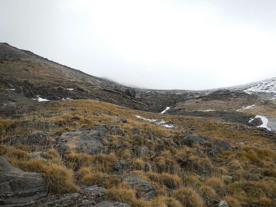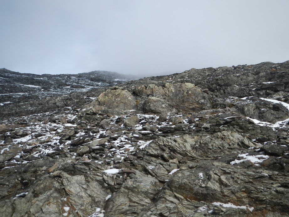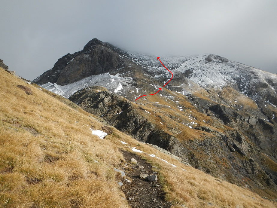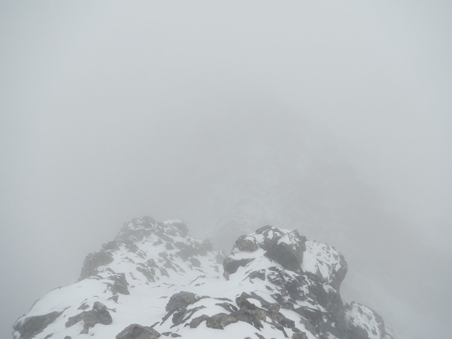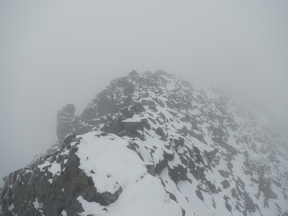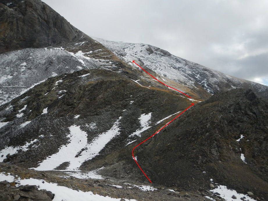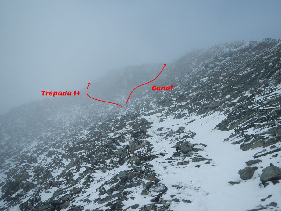Acaba la pala pedregosa y debemos ganar la arista. Dudamos en este punto, a la derecha una canal algo tapada por la nieve y a la izquierda una sencilla trepada.