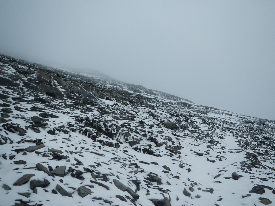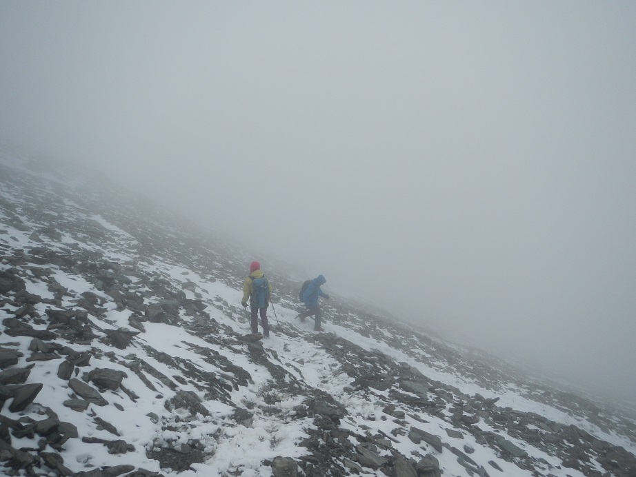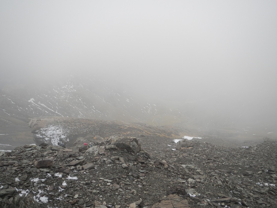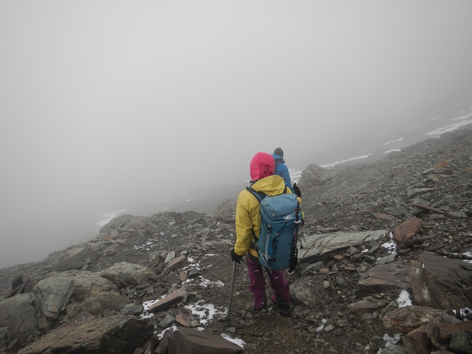 La niebla ha bajado hacia el valle y parte de la nieve que hemos pisado hace solo un rato ha desaparecido.