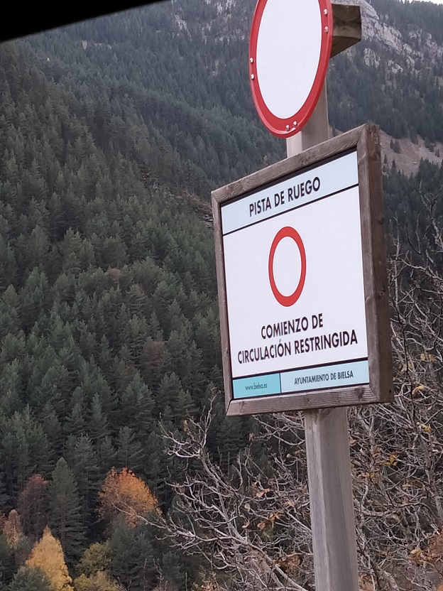 Para llegar a la Borda de Bruned debemos circular por la pista de Ruego, de pago. Hay que sacar un ticket de 3 € (2022) en una máquina expendedora ubicada en las piscinas de Bielsa (salida sur).