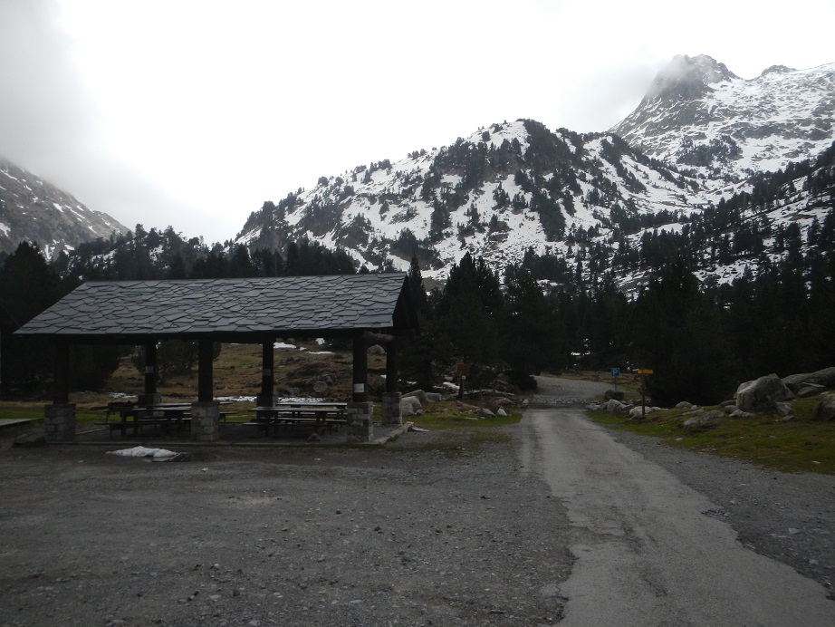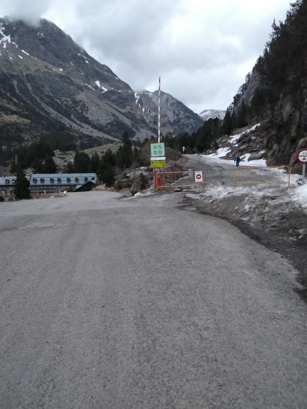 Desde el parking, seguimos la carretera asfaltada que nos lleva hasta el hotel de Los Llanos del Hospital y dejando el hotel a la izquierda tomamos la pista de la Besurta. Encontramos la pista cerrada al tráfico y sin nieve, por lo que tenemos por delante un largo porteo.