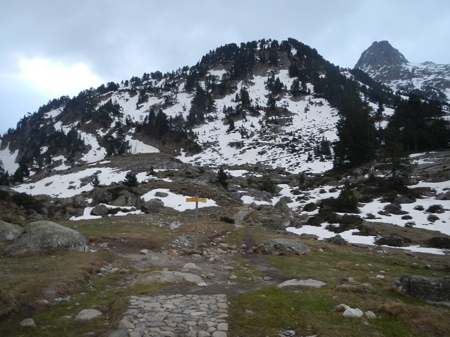 Seguimos el sendero de verano que nos lleva al refugio de la Renclusa hasta encontrar un poste indicador. Nos desviamos a la izquierda en dirección a Aigualluts.