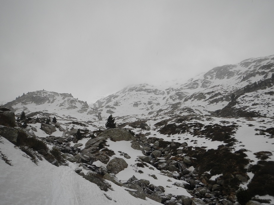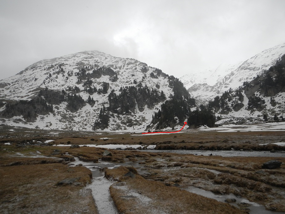 Buscamos los tramos con nieve, pero no podemos llegar hasta Aigualluts con esquís.