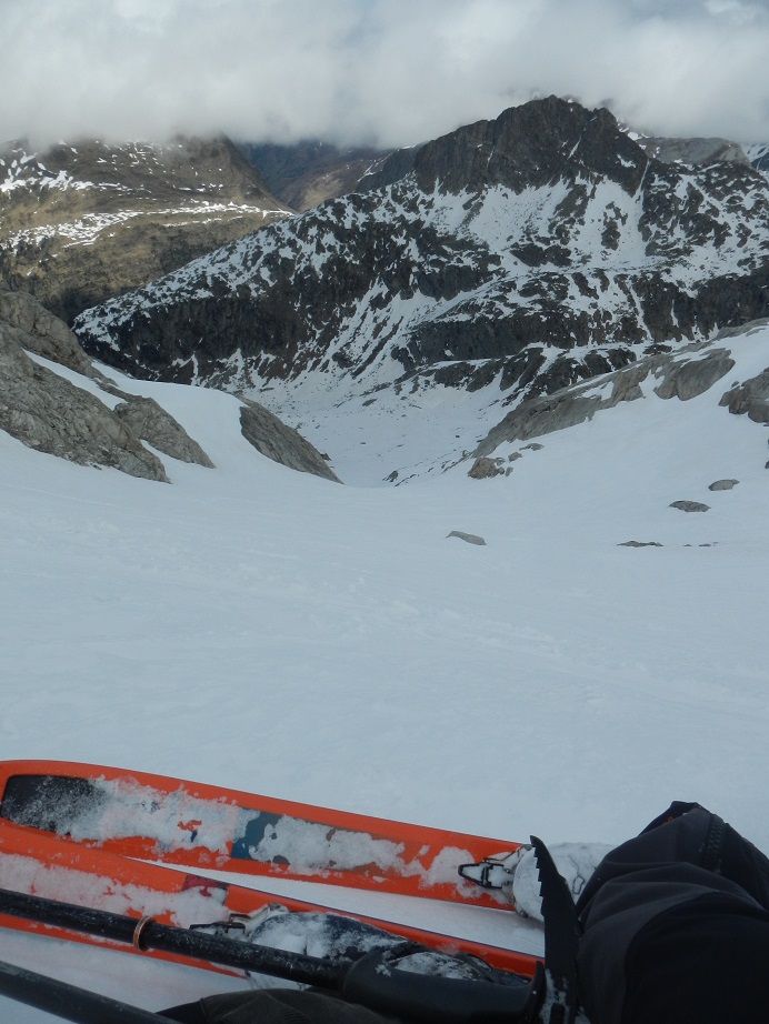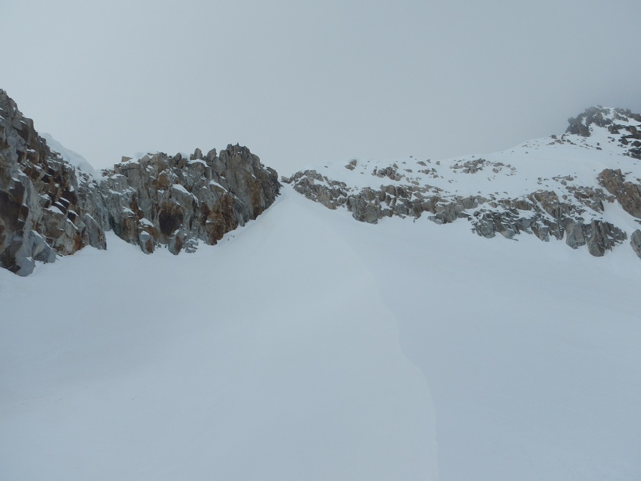 Llegamos a un gran plano bien innivado. Las posibilidades son múltiples, pero nos dirigimos hacia una evidente canal de pendiente moderada a la derecha.
