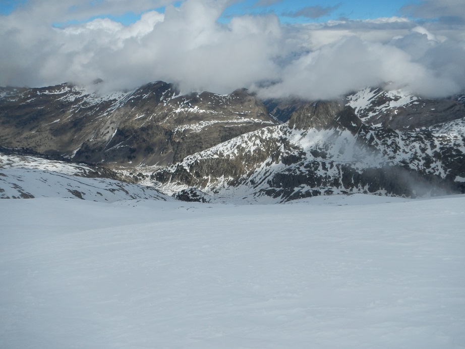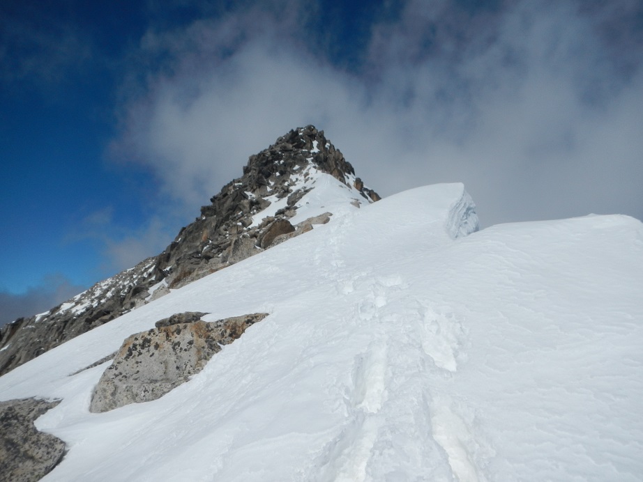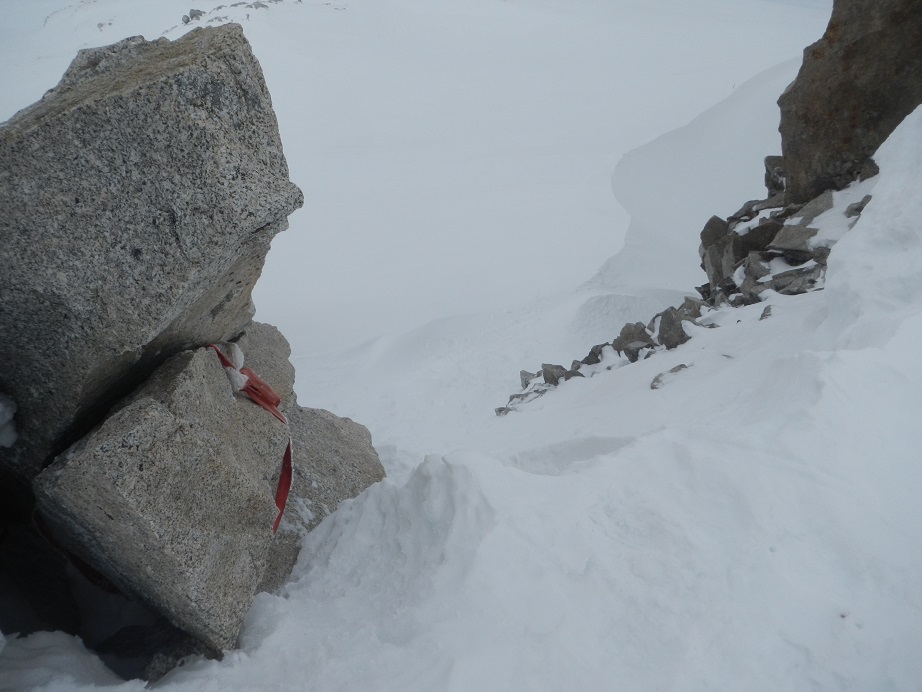 El retroceso del glaciar y la poca nieve de este año hacen que solo quede una delgada línea de nieve hasta el collado. Quizás en los años sucesivos será complicado acceder por aquí sin tener que realizar un tramo en mixto.