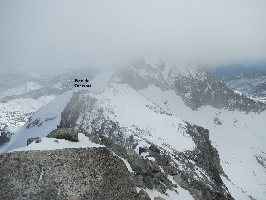 Superado este tramo, a la derecha tenemos el pico del Medio. Primero seguimos la arista de nieve. Luego, por roca, siguiendo los hitos, realizamos una travesía por la vertiente de Coronas (izquierda) en la que tendremos que apoyar las manos en algún punto.
