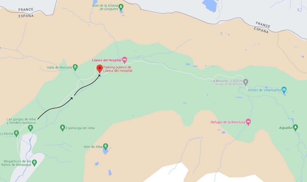 Ahora debemos caminar hasta la Besurta primero y después hasta el parking de los Llanos del Hospital, unos 7 Km en total.
