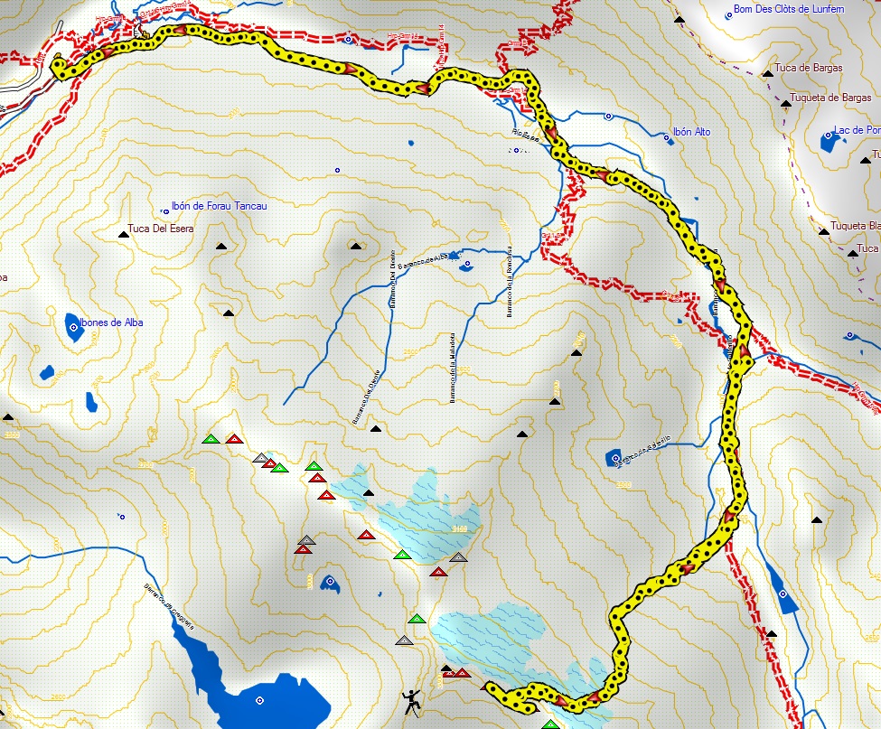 En este punto todavía no encontramos nieve continua. Podríamos girar a la derecha y comenzar la ascensión hacia el glaciar, pero vale la pena caminar un poco más en dirección a la colladeta y el ibón de Barrancs.