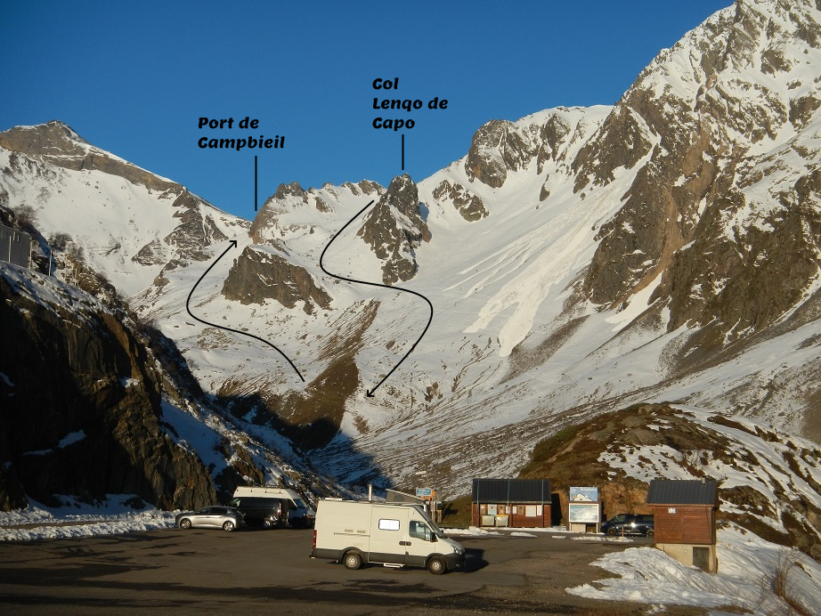 Desde el parking podemos ver parte de la ruta. Ascendemos por el Port de Campbieil y descendemos por un collado a la derecha del pico Lenqo de Capo.