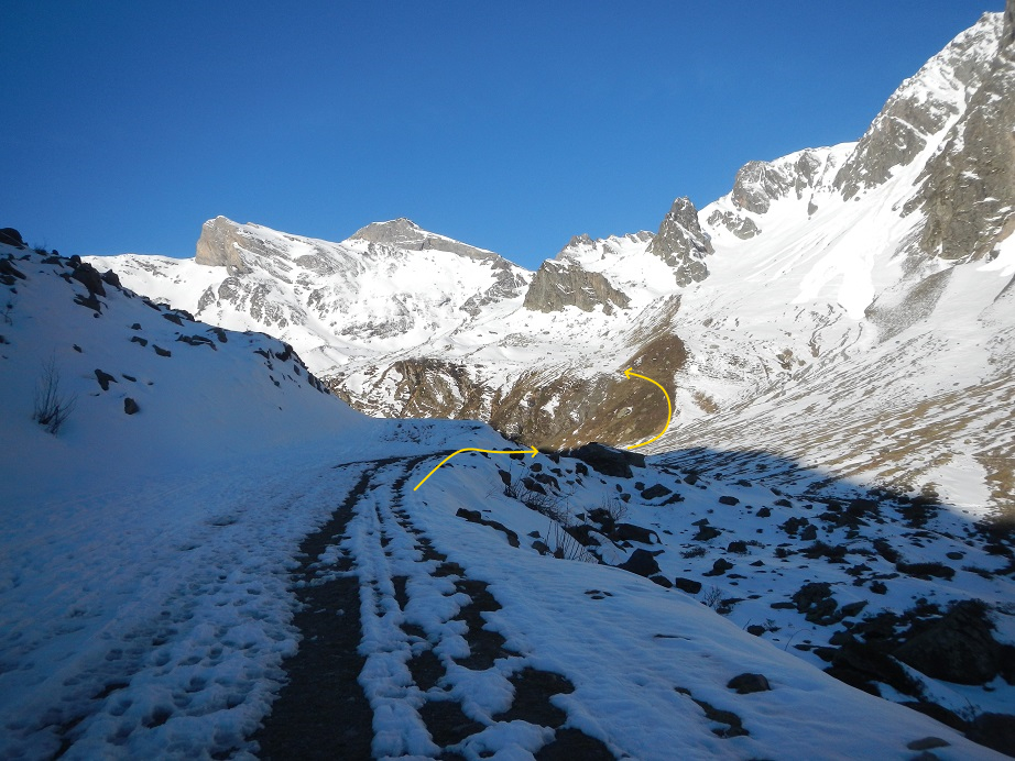 Con buenas condiciones de nieve se puede ascender con esquís hasta el inicio del corredor, donde es más conveniente cambiar a crampones ya que aumenta la inclinación.