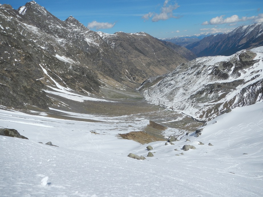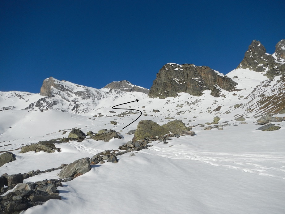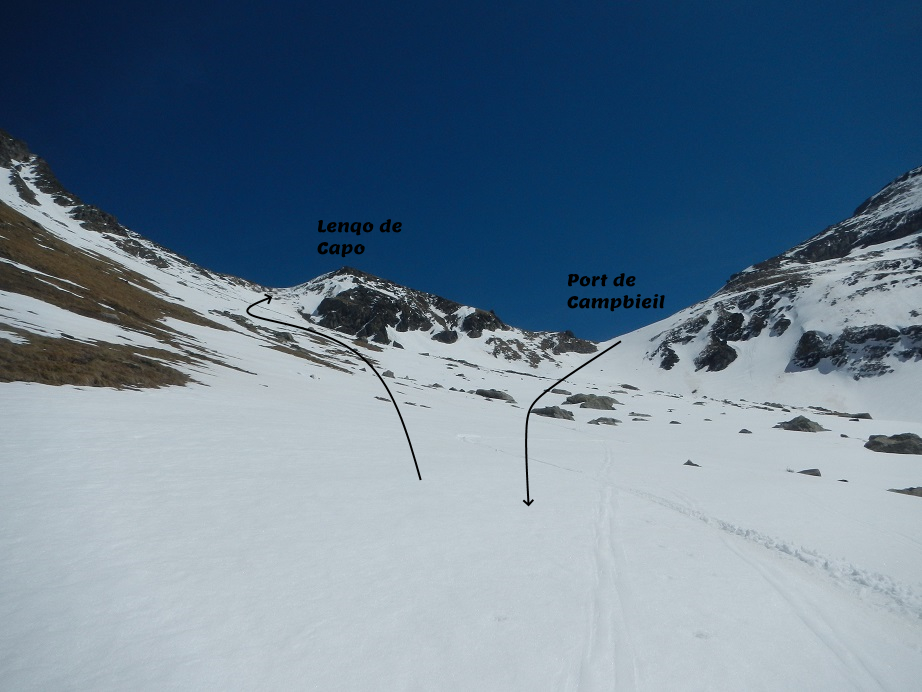 En el Pla de Targo, volvemos a poner pieles de foca. Podríamos volver por el mismo camino, pero elegimos el collado de la izquierda, que queda bajo el pico Lenqo de Capo. En el último tramo debemos descalzar esquís unos metros.