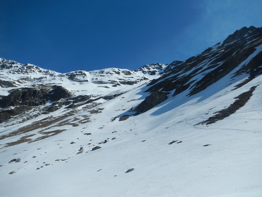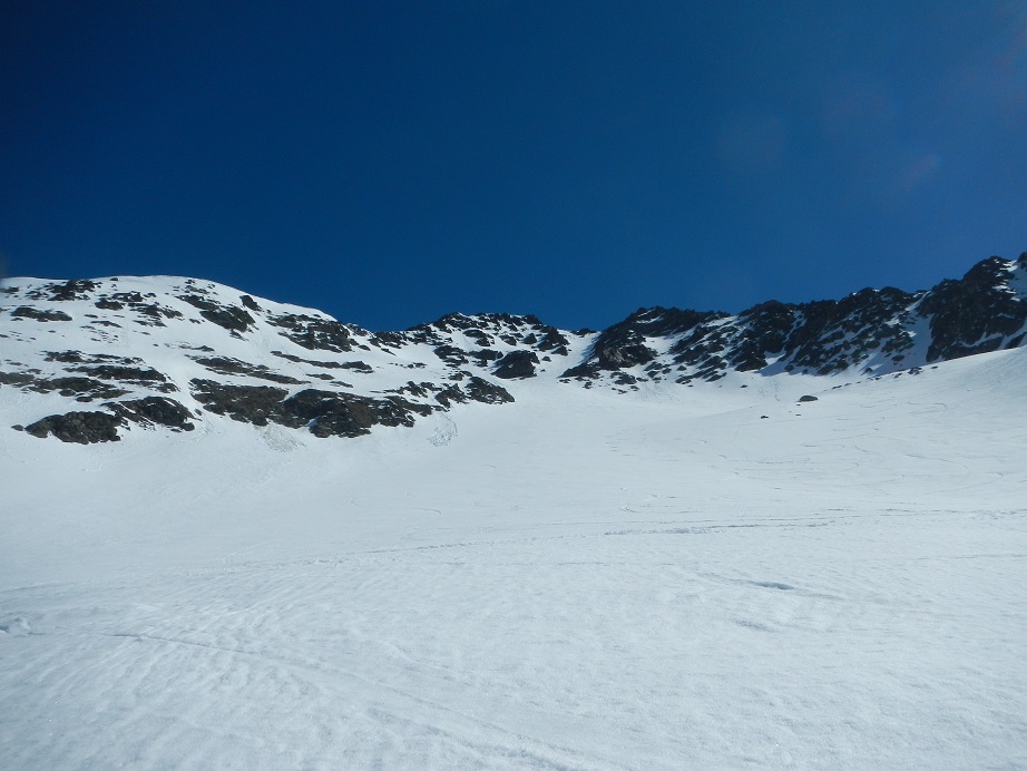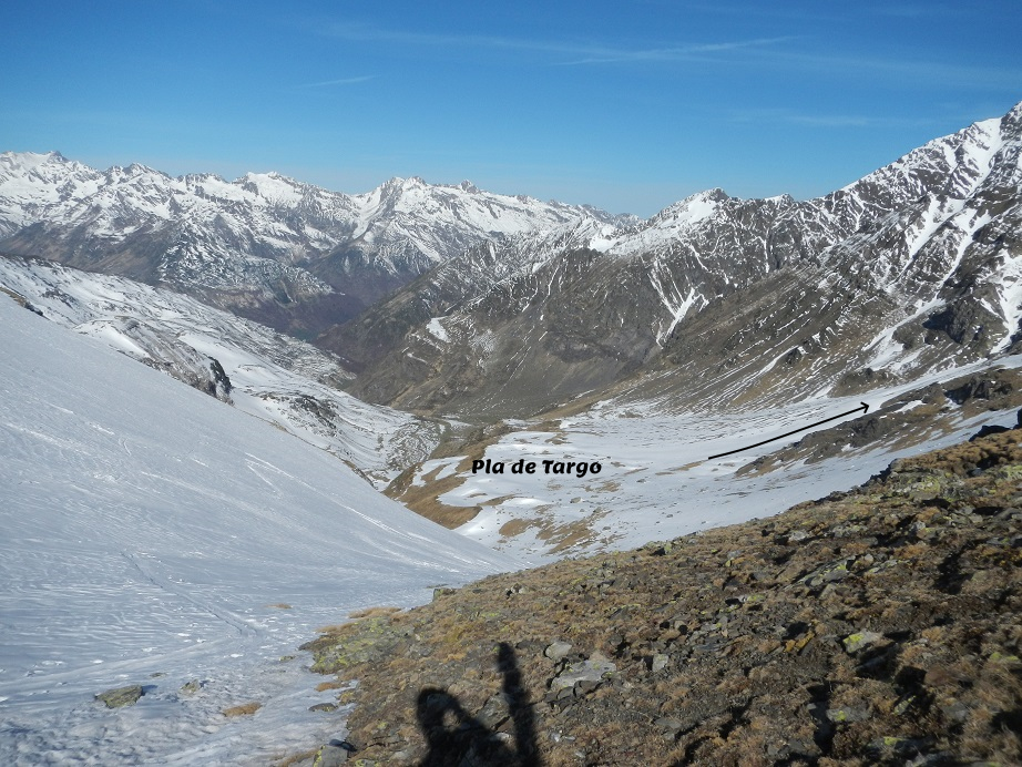 Lo realizamos por el mismo camino hasta el Pla de Targo. Primero caminamos hasta el comienzo del corredor, donde calzamos esquís y descendemos con cuidado el primer tramo, más estrecho y más inclinado. Luego por anchas palas esquiamos a placer, 800 metros en total.