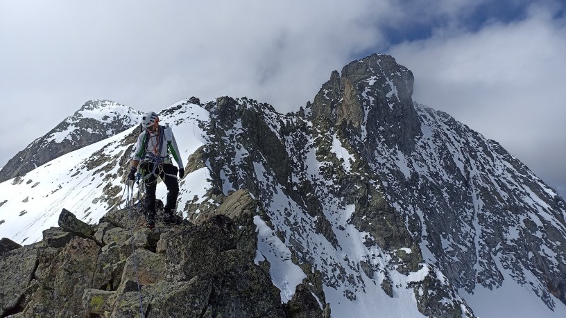 Descendemos unos metros hasta que vemos factible volver a ganar la arista. Solo quedan unos metros fáciles para llegar a la primer cumbre del día Aguja Tourrat.