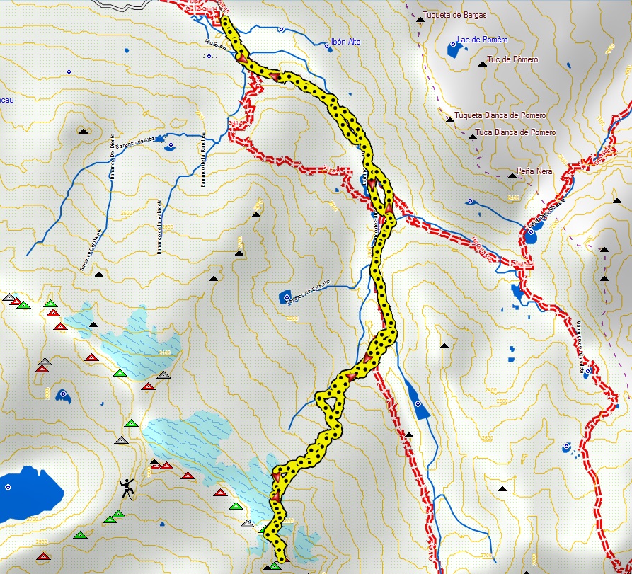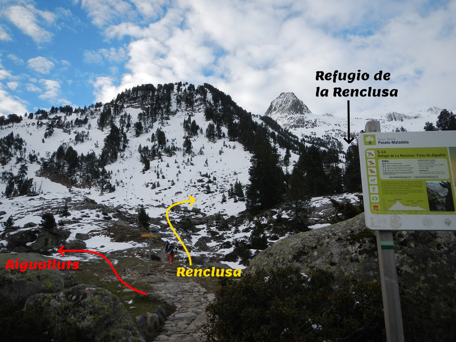 Llegamos a un cruce de caminos. Recto un sendero nos lleva hasta al refugio de la Renclusa. Buena opción para realizar una ruta circular y que prácticamente nos asegura encontrar huella trazada hasta el Aneto.
