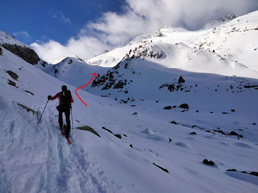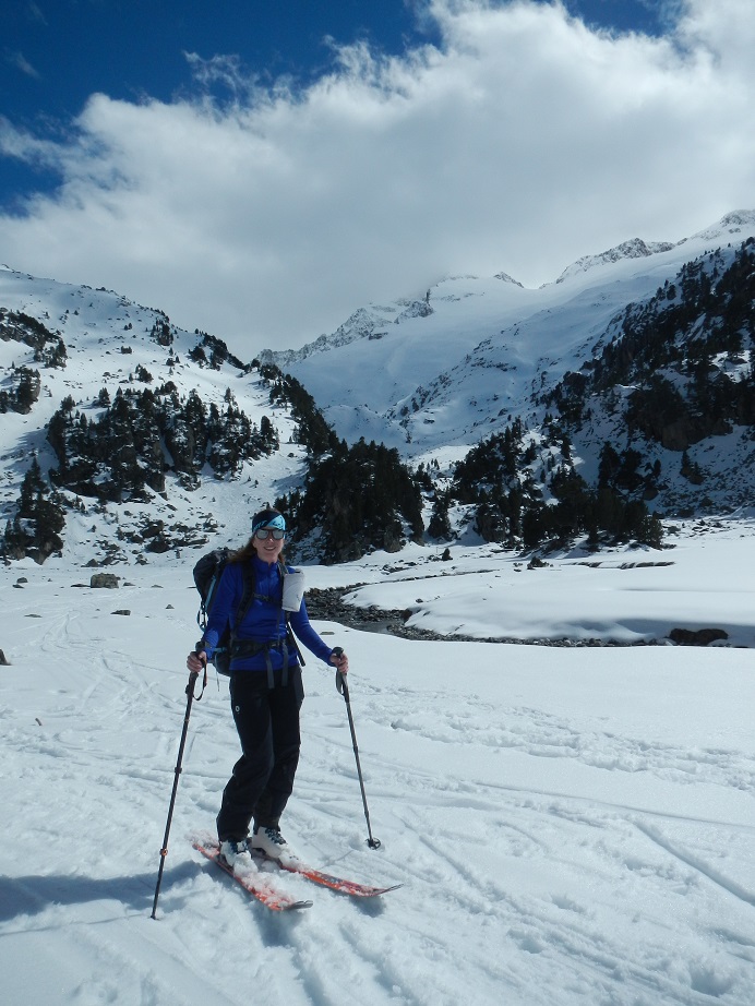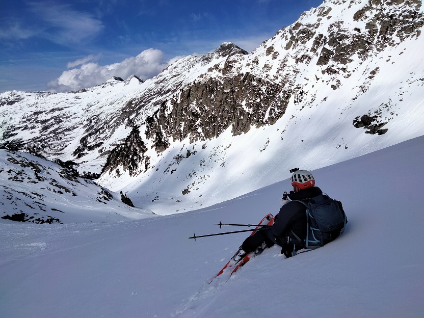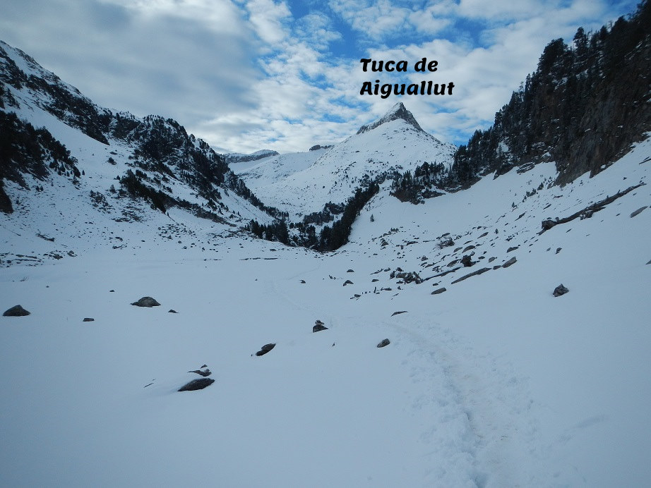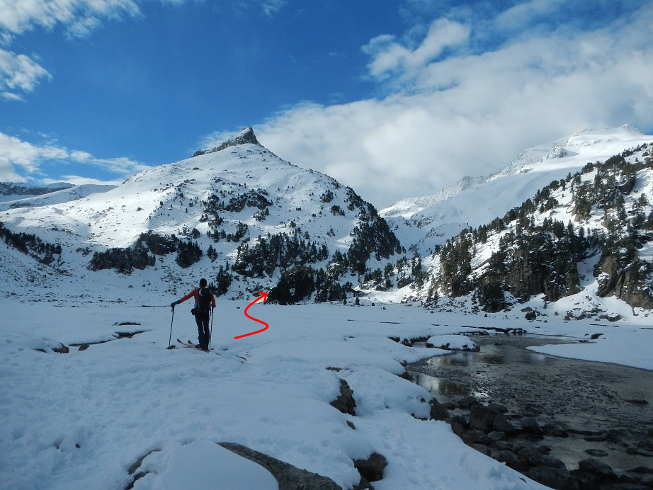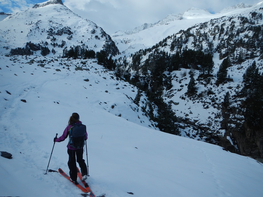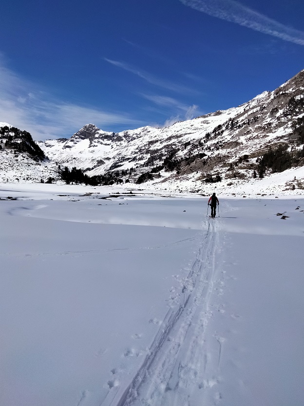 Alcanzamos el Plan de Aigualluts y lo atravesamos. Al llegar al final no ascendemos por la ruta de verano, buscamos una pala de nieve bien innivada a su izquierda.