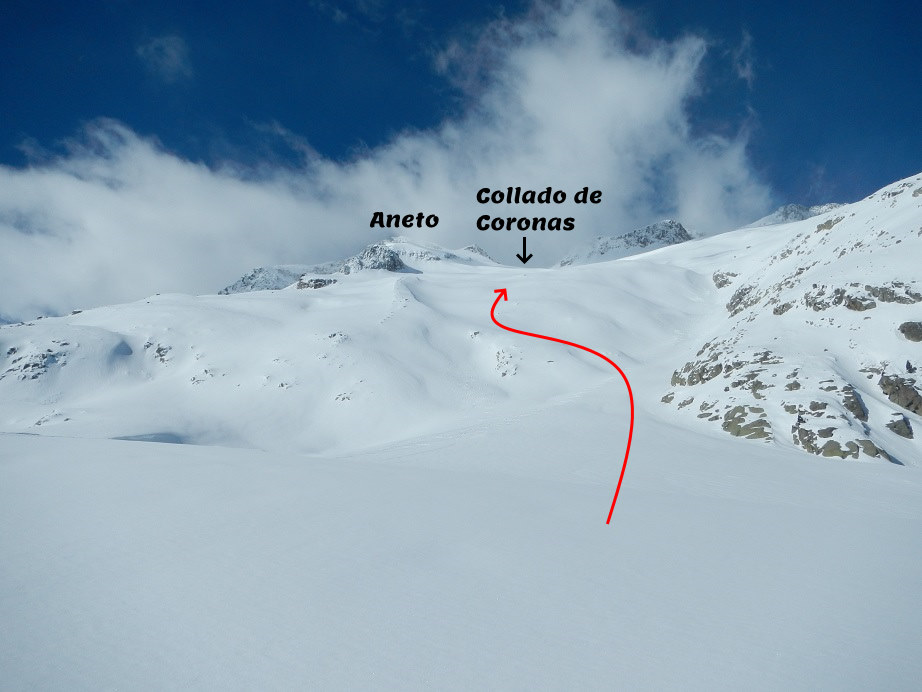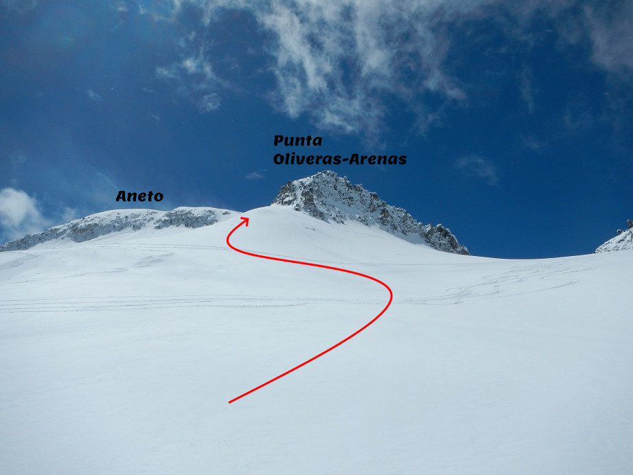 Ahora debemos dirigirnos a un collado entre el Aneto y la Punta Oliveras Arenas.