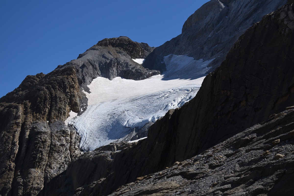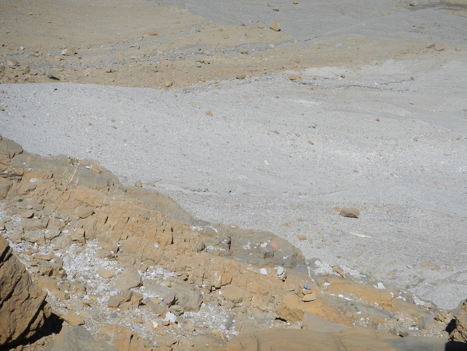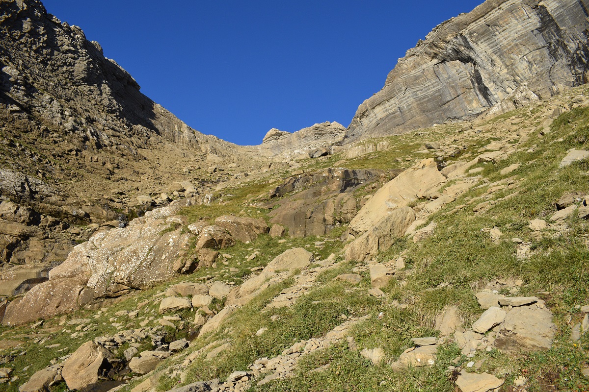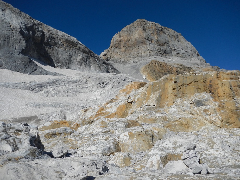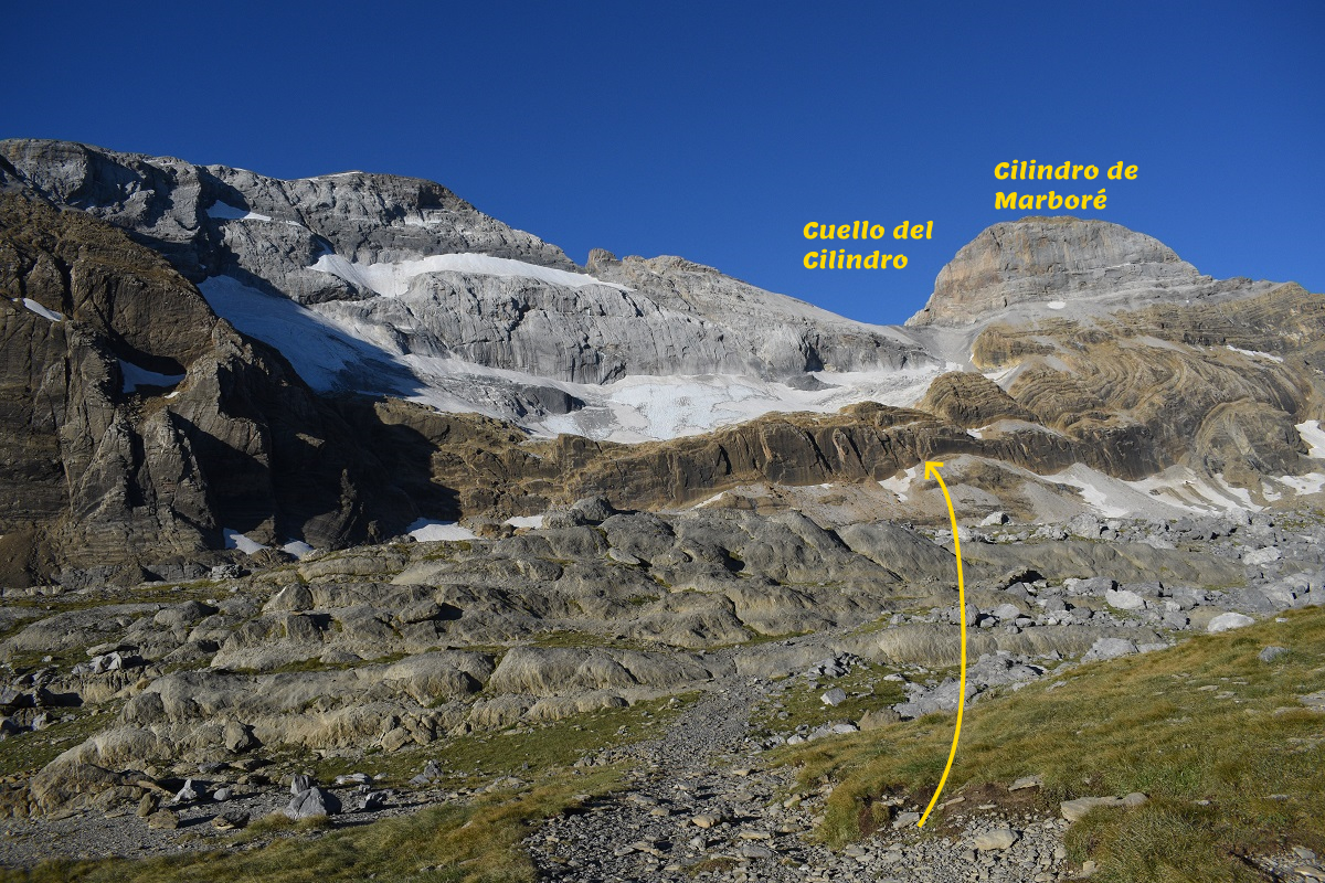 A partir de aquí, fuera de sendero, debemos orientarnos e ir buscando los hitos que de dirigen en ligero descenso hasta el río Cinca primero (O) y hacia la gran muralla de roca a la derecha del glaciar, después (SO).