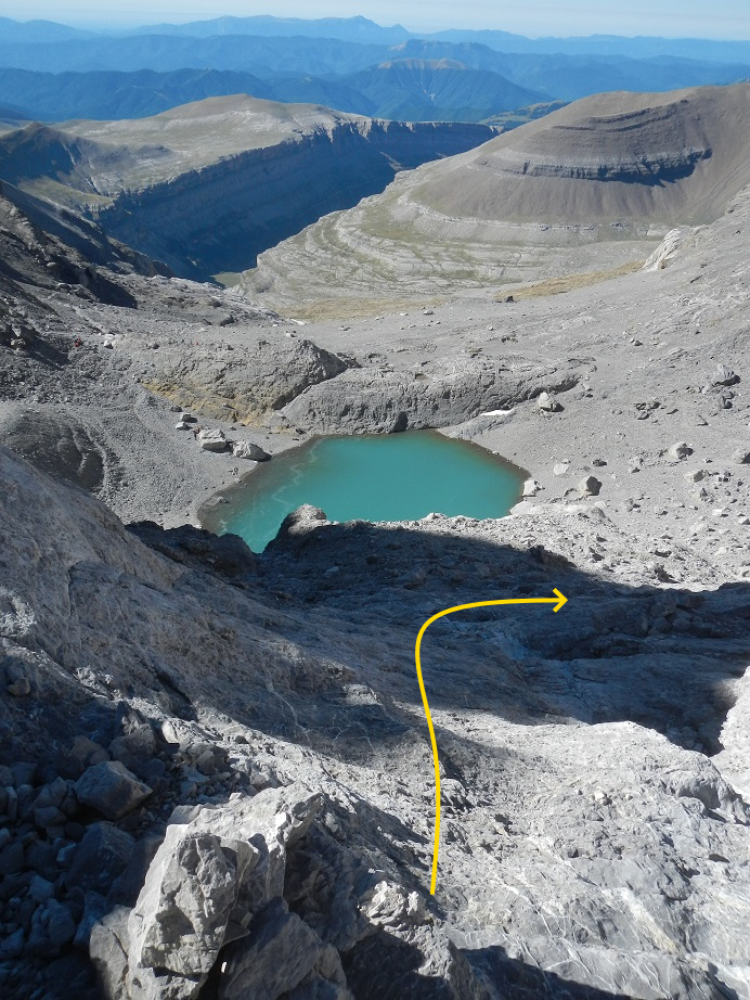 Cuando termina la vira, giramos a la izquierda y realizamos un corto y sencillo destrepe. Ahora debemos descender hasta el lago Helado y seguir la ruta que asciende desde el refugio de Góriz.