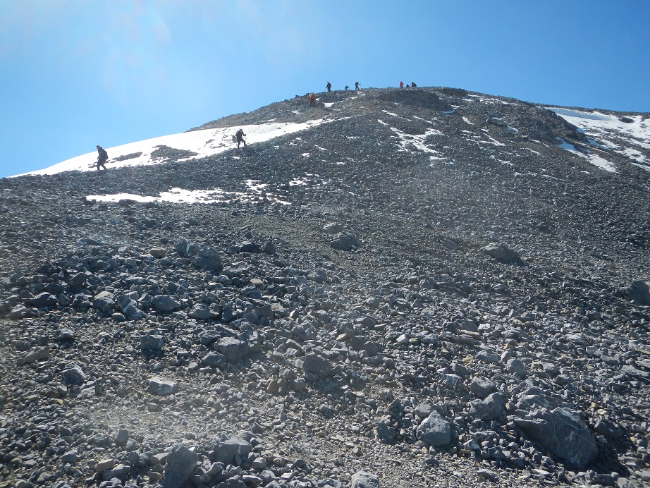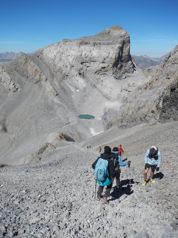Superada la chimenea, debemos dirigirnos al cuello del Cilindro, collado que nos da acceso al lago Helado. En la última parte encontramos terreno muy descompuesto que dificulta e incomoda la progresión.