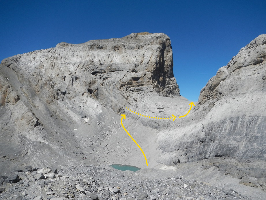 Hasta llegar al lago Helado. Debemos buscar la vira por la que descendimos para llegar al cuello del Cilindro.