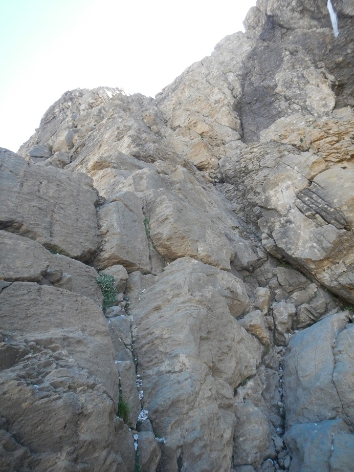 Ascendemos por el espolón de la derecha hasta alcanzar el tramo de la escupidera, ahora sin nieve y sin ninguna exposición, pero de terreno muy descompuesto e incómodo.