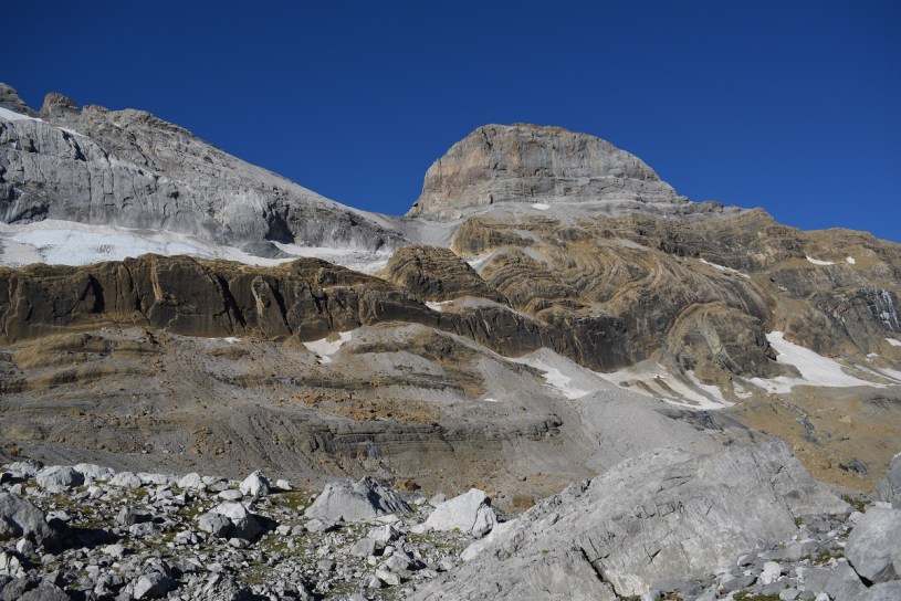 A partir de aquí, fuera de sendero, debemos orientarnos e ir buscando los hitos que de dirigen en ligero descenso hasta el río Cinca primero (O) y hacia la gran muralla de roca a la derecha del glaciar, después (SO).