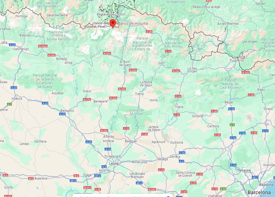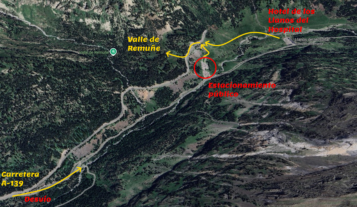 Conducimos hasta el pueblo de Benasque y lo cruzamos, siguiendo la carretera A-139 hasta casi su final. Antes, encontramos un desvío a la derecha que nos lleva primero hasta un estacionamiento público a la izquierda. Si seguimos la carretera llegaremos hasta el hotel de los Llanos del Hospital.