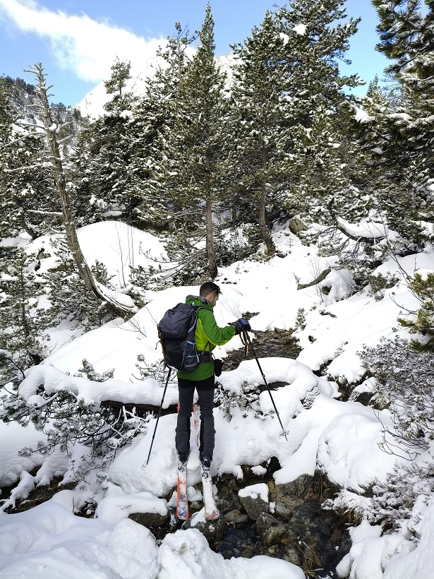En nuestro caso, encontramos unas fantásticas condiciones, que nos permitieron ascender hasta la cumbre desde el hotel de los Llanos del Hospital sin descalzar esquís. En el bosque, eso sí, tuvimos que descalzar brevemente para cruzar algunos pequeños arroyos.