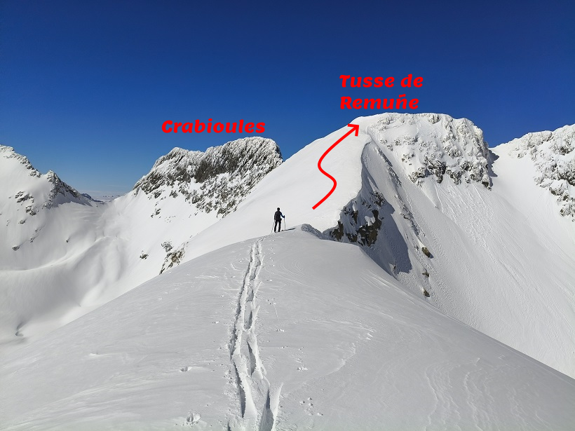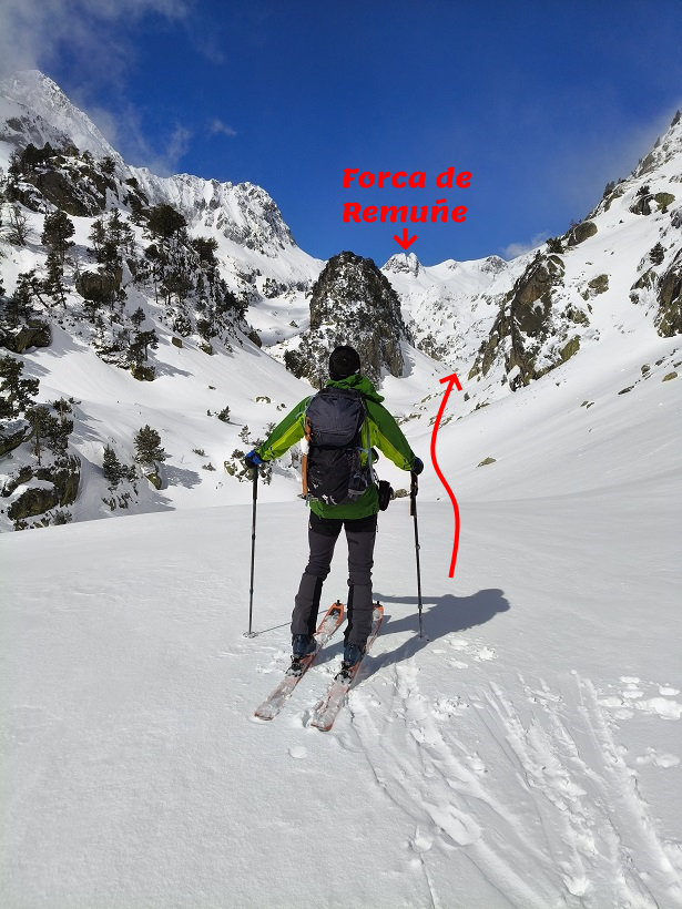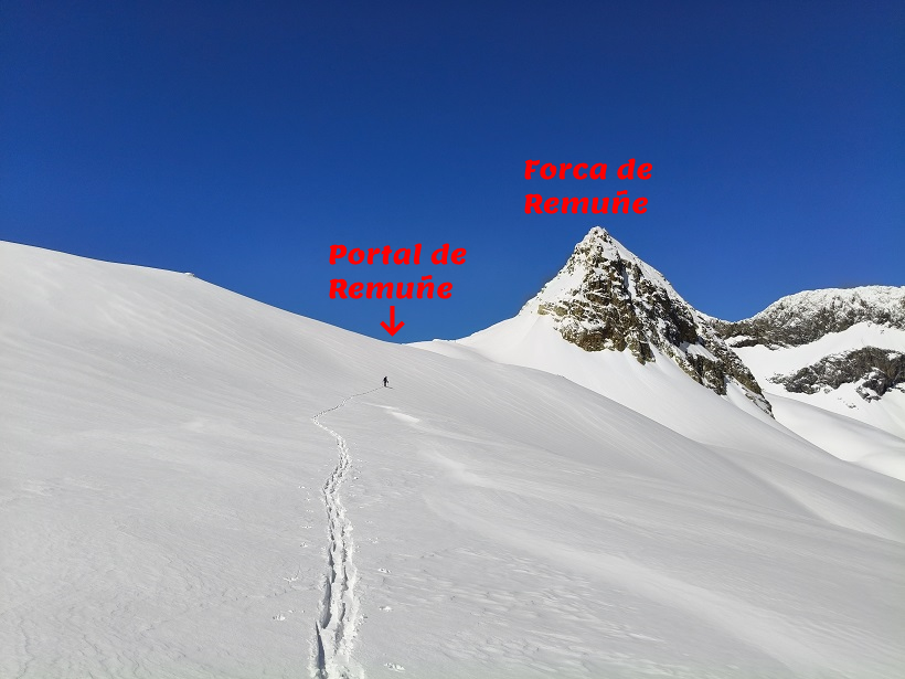 Para llegar hasta su cumbre debemos transitar por el precioso valle de Remuñe. Recorreremos suaves pendientes hasta llegar al Portal de Remuñe, donde giraremos a la derecha (N) dejando a nuestra izquierda el pico Perdiguero y el ibón Blanco de Lliterola. Progresaremos por una arista de nieve y deberemos superar una última pala algo expuesta en caso de nieve dura.