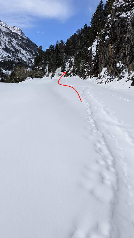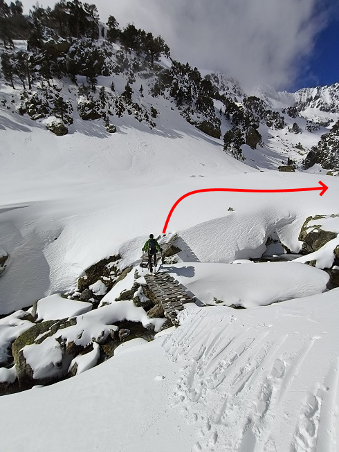 Un puente de madera nos facilita el cruce del río Remuñe. En nuestro caso lo cruzamos, ya que observamos que más adelante hay nieve continua para volver a cruzarlo. Así evitamos una zona más inclinada. Debemos valorar antes las dos opciones en función de las condiciones.