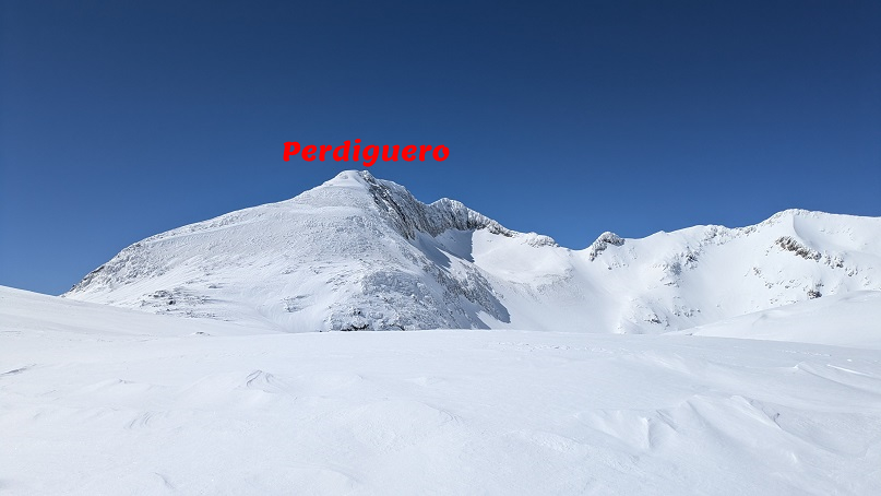 Desde el collado, vemos el imponente Perdiguero. Su pala sureste, rara vez presenta condiciones para el esquí, al estar muy castigada por el viento. En la foto se puede ver la nieve muy venteada.