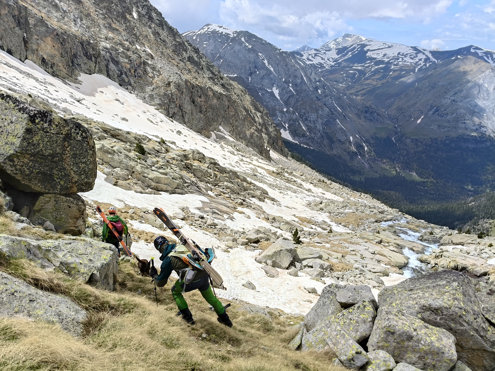 En la base del corredor calzamos esquís y disfrutamos del último descenso de la temporada. Nos dejamos caer hacia la cresta de Llosás en lugar de descender por el mismo camino de ascenso.