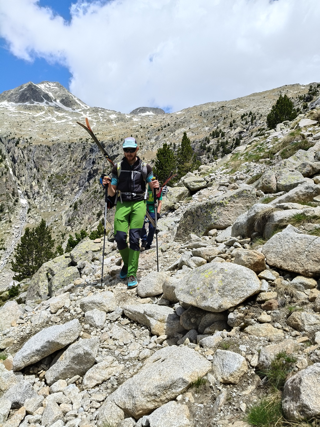 Cerramos la temporada de esquí de montaña 24-25 en la vertiente sur del macizo de la Maladeta. Dos semanas atrás, ascendimos el corredor Estasen y aún quedaba una cantidad considerable de nieve. Sin embargo, el calor y la lluvia recientes han reducido notablemente el manto, aunque todavía es posible calzarse los esquís a partir de los 2.600 m, en el ibón Inferior de Coronas.