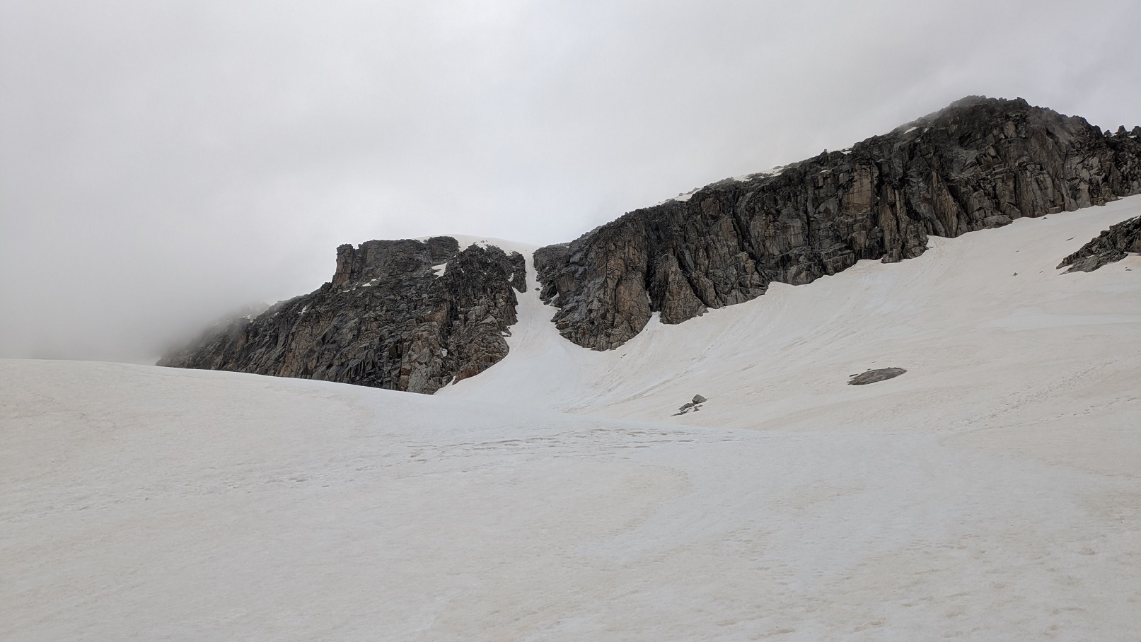 Al salir del corredor debemos ascender por una campa de nieve de pendiente moderada durante 10 min para llegar a la cumbre del Pico Coronas.