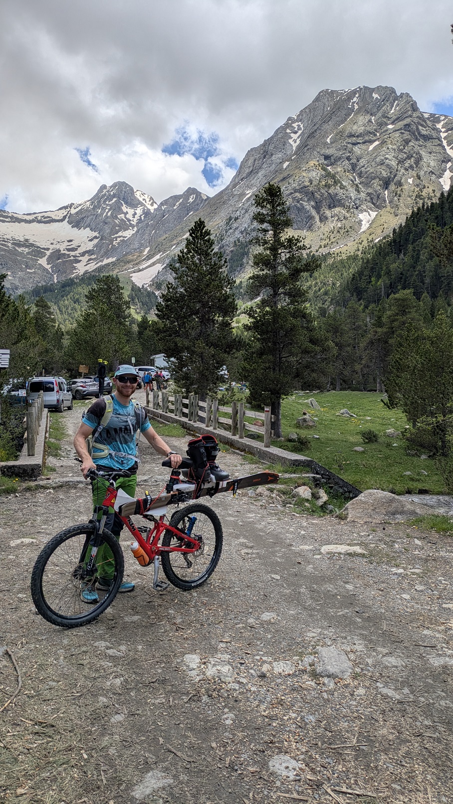 Quedamos a las 05:00 en el refugio de Coronas con Jordi, que asciende en bici desde Pla de Senarta. Ha preparado un invento para transportar los esquís que le ha funcionado de maravilla. Seguro que lo volvemos a utilizar en el futuro.