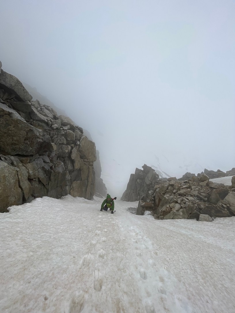 Esquiamos hasta la base del corredor y pasamos a crampones y piolet, ya que encontramos una capa de nieve húmeda poco consistente sobre nieve dura.